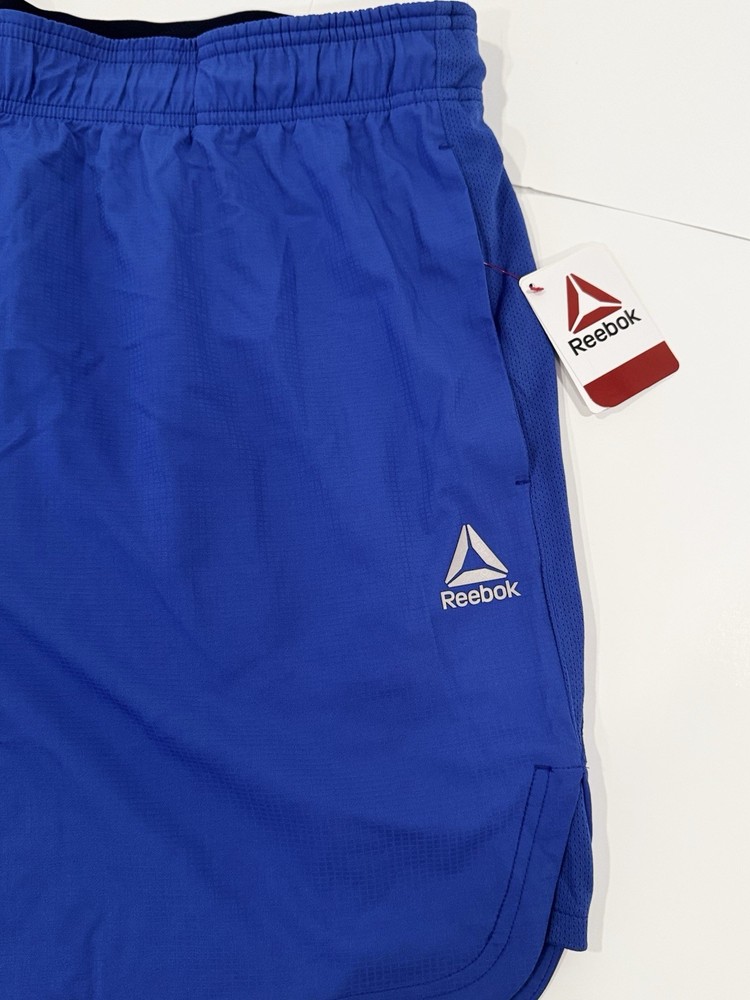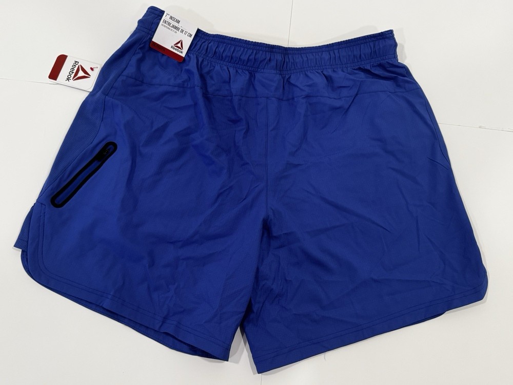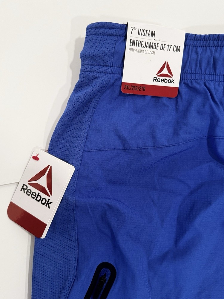 Fabric Type: Knit Style: Athletic Theme: Sports Closure: Drawstring Size: 2XL Brand: Reebok Material: Polyester Occasion: Activewear Performance/Activity: Running Fit: Athletic Department: Men Pattern: Solid Color: Blue Features: Quick Dry, Stretch, Comfort Inseam: 7 in Season: Summer Garment Care: Machine Washable Size Type: Regular