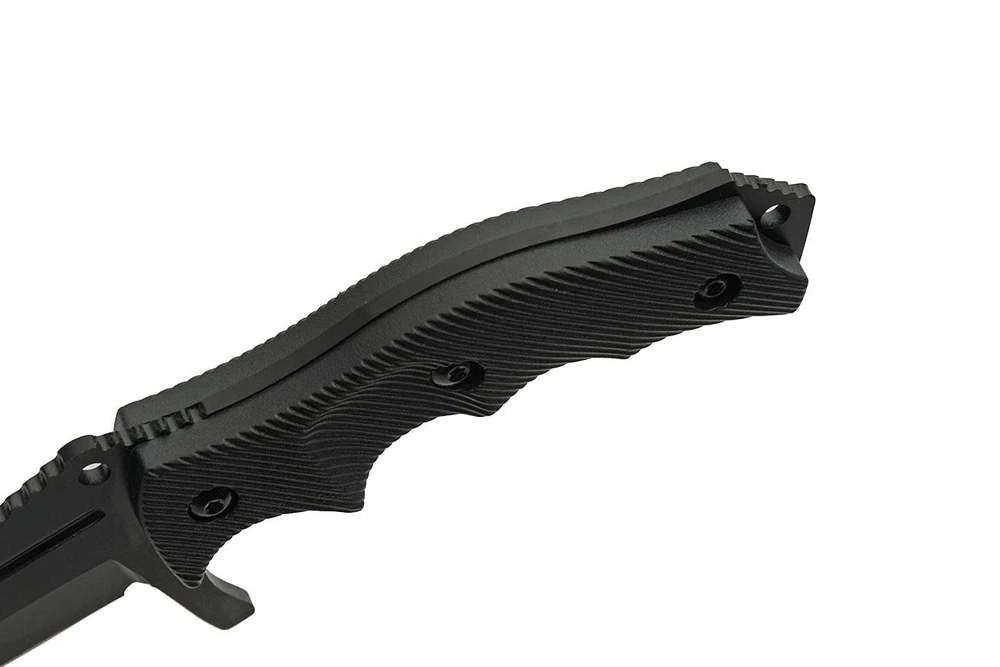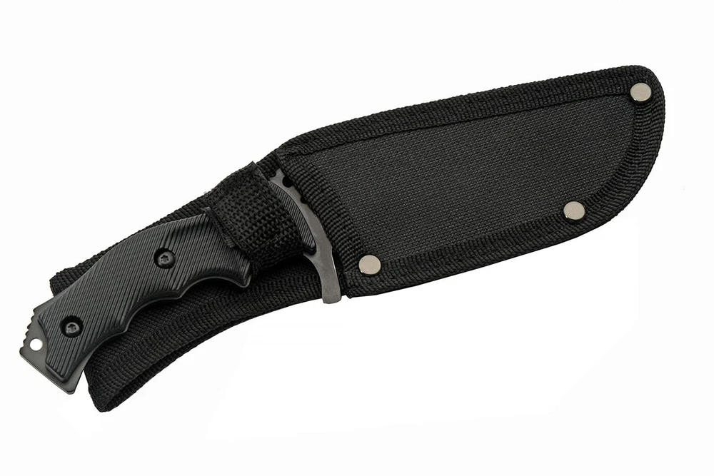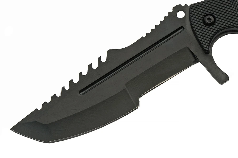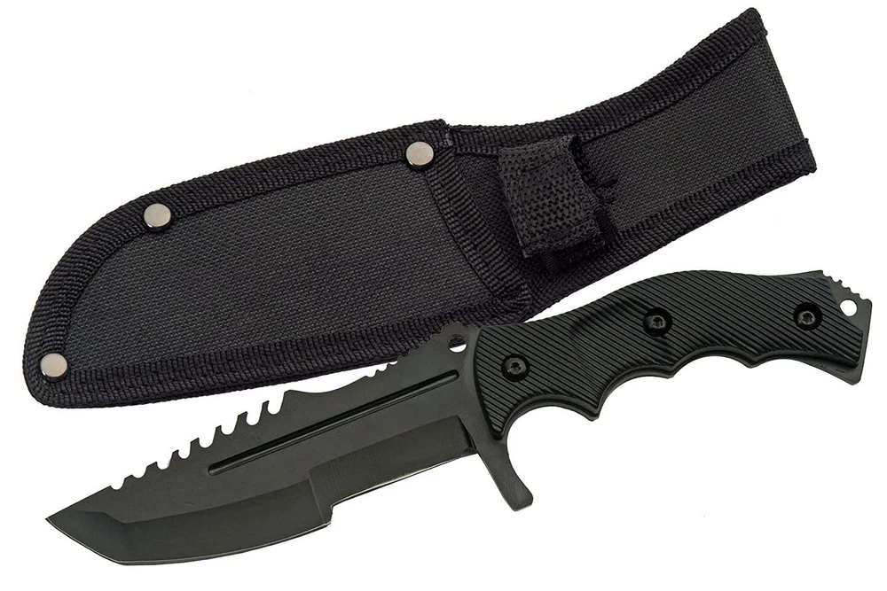 New Rite Edge Hunter Black Fixed Blade Knife 211548-BK 8.5" (21.59cm) overall. 4.5" (11.43cm) black finish sawback stainless blade. Black finger grooved ABS handle. Full tang. Lanyard hole. Black nylon belt sheath. Boxed. Features Dimensions: 8.5 inches in overall length with a 4-inch handle. 4.5 inches in overall blade length 1.25-inch width and 3mm thickness. Lasting: This tanto knife features a full tang sawback blade made from premium quality 440 stainless steel treated for long-lasting edge retention and resistance to rust and corrosion. Handle: The handle on this survival knife is made with a strong ABS material grooved and ergonomically designed with finger ridges and a partial guard for optimal efficiency when in use. Sheath: Accompanied with the all-black tactical knife is a durable nylon sheath with a belt loop for safe storage and easy on-the-go access. Application: This is an ideal outdoor knife for everyday carry to assist in all your, hiking, camping, hunting, fishing and survival needs. Makes an excellent gift knife for the knife enthusiast in your life. Details Fast and Free Shipping We get your order shipped out within 1-business day and delivered to your doorstep as quickly as possible. Competitive Pricing With our dynamic pricing model, our prices are always competitive. Our prices are some of the lowest that you will find on the internet. Rest assured that you're getting a good deal when purchasing with us. 30-day Money Back Guarantee We are committed to making sure that you leave this transaction satisfied. If you're unhappy with the product for any reason, you may return it back for your money-back or a replacement within 30 days. No questions asked!