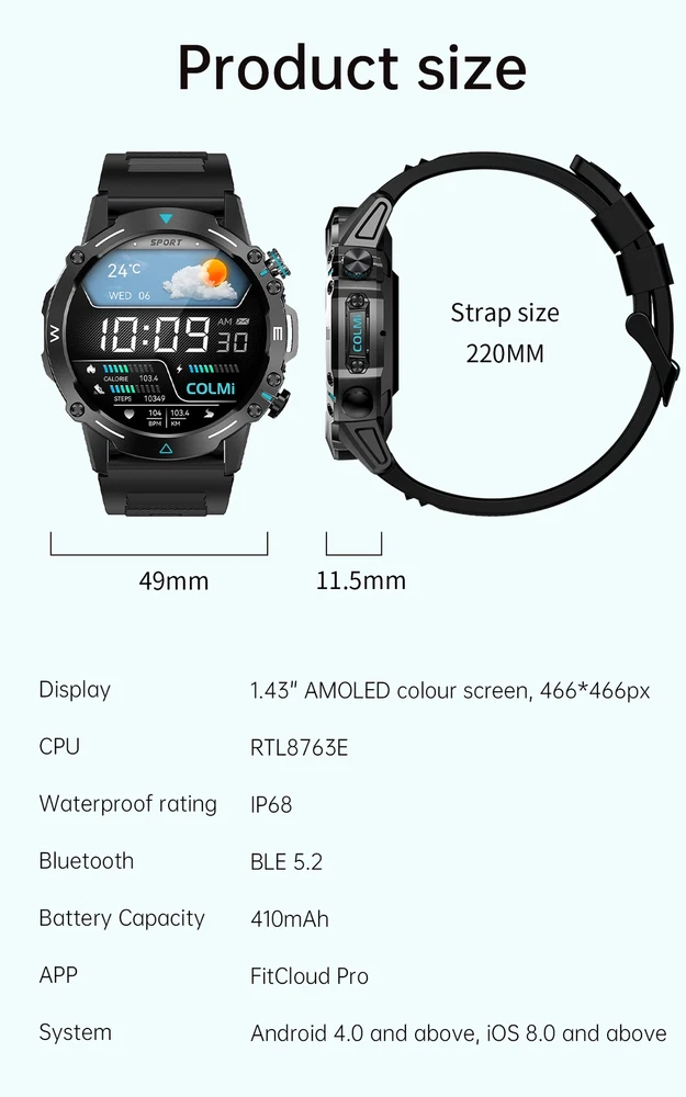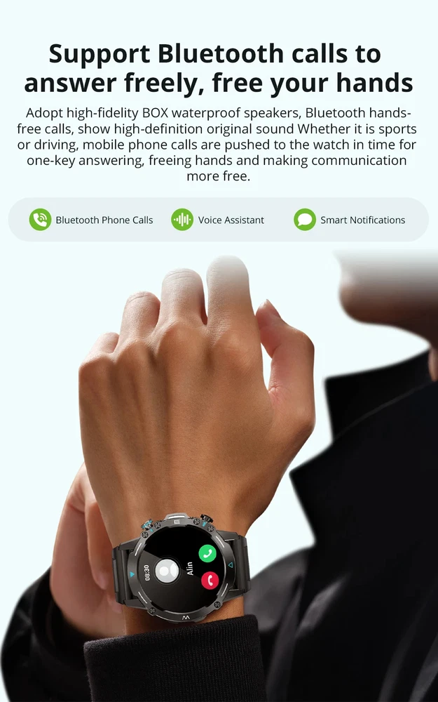 • 1.43'' AMOLED Display : Enjoy a clear and immersive viewing experience with the 1.43'' AMOLED display. • 100 Sports Modes : Choose from a variety of sports modes to track your activity and achieve your fitness goals. • Voice Calling : Make and receive calls hands-free with the built-in voice calling feature. • Military Grade Toughness : The watch is designed to withstand harsh conditions and extreme temperatures, making it perfect for outdoor activities. Features Health Features: 24/7 Heart Rate monitor, Blood oxygen sensor, Sleep Monitor, Breathe, Stress Monitor, Drink water reminder, Activity reminder, Women's health, Support health APP. Life Features: AOD, Bluetooth Answer Call, Bluetooth Dial Call, Contact person, Call records, Messages Reminder, Alarm clock, Timer, Weather, Music remote, Camera remote, Find phone, Calculator, Dynamic watch face, watch face market (270+ watch faces), custom watch faces(you can set the picture you like as the watch face), Set the screen off time, Do not disturb mode. Built-in 4 User Interface. Sports Features: All-Day Activity Tracking( Steps, calories, distance, Goal ), IP68 waterproof, 106 Exercise Modes, Sports Data Report. Watch Faces APP: 270+ System Default: 10 Always-on Displays: 2 Customize Watch Faces: Support Language Chinese, English, Russian, Spanish, Portuguese, French, Japanese, Arabic, Italian, German, Czech, Greek, Malaysian, Indonesian, Polish, Thai, Vietnamese, Finnish, Romanian, Turkish, Croatian.