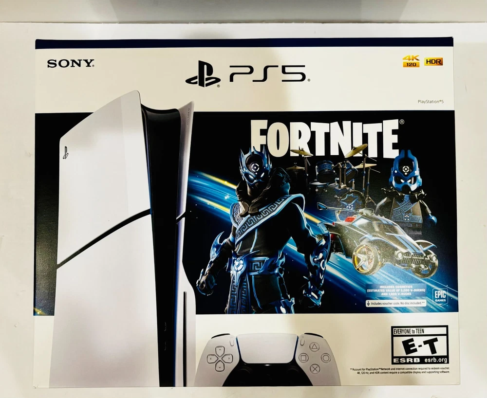 New Sony PlayStation 5 Slim 1TB Disk Console with Dual-Sense Controller with exclusive Fortnite Cobalt Star Bundle in the original sealed box with the original box content