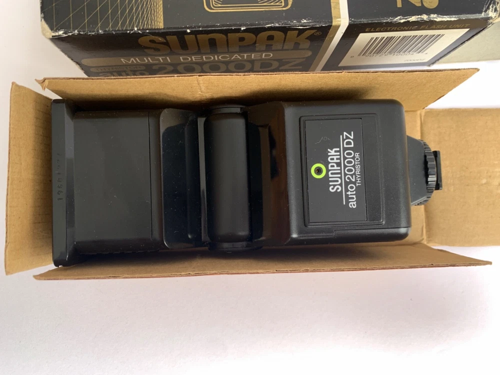 New vintage Sunpak Multi Dedicated Auto 2000DZ Thyristor Flash shoe mount for cameras. Still in box, Looks like it has never been used, new. See photos for details, message me with any questions
