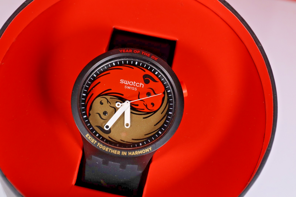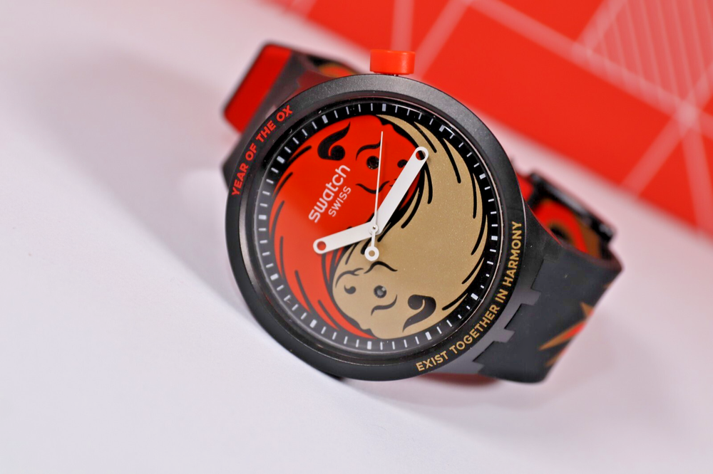 Nothing shouts BIG BOLD like the OX does. OX ROCKS 2021! (SO27Z109) is a must-have celebratory piece for the Chinese New Year and it comes right on time. Warmed up by the fiery black, red and gold-colored strap, the dial represents the perfectly harmonious Ox in a Ying and Yang shape, adorned with two black crystals. Movement : Quartz Water resistant : 3 Bar Collection : Special Packaging : Special Diameter : 47.00 mm Thickness : 11.75 mm Lug-to-lug : 44.80 mm Strap material : Silicone Clasp material : Aluminium Strap buckle : Half Buckle Case material : Polymer Color : Black Strap color : Black Dial color : Red Case color : Black Product family : BIG BOLD