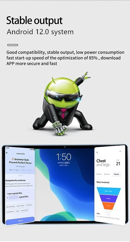 Tablet 10.1 inch Ultra Big Android 12 Tablets, 256GB Storage,8GB RAM, 8800 mAh Battery , 10-Core 2.0gHz CPU,2 Speakers, 4G/5G WiFi with Case Bullet Point ★ 10.1 LARGE DISPLAY& 10 CORE CPU: Experience ultimate performance with the Weiboer Android Tablet featuring a robust 10-core CPU, 8 GB RAM, and 256GB internal storage. Expand up to 512 GB with microSD (sold separately). Enjoy seamless multitasking on the fast and responsive tablet. Its 10.1inch 1920x1200 full screen with a wide viewing angle offers high-resolution images, providing a more realistic and powerful visual experience. ★ UPGRADED ANDROID 12 TABLET: 10.1 inch google android tablet is equipped with a new upgraded system "Android 12", providing a more personalized, safe and easy-to-operate system experience. You can install apps like Netflix, TikTok, YouTube, LINE, Yahoo, Twitter from the Google Play Store on your GMS certified tablet. ★ 8800MAH LONG LASTING BATTERY: The 10.1 inch Computer Tablets is equipped with battery up to 8800mAh. Achieve up to 8 hours of video battery life, and use the Type-C port to charge more easily, regardless of positive or negative. With a weight of 996g, it is very convenient to carry it with you whether you are working, studying or going out. ★ MULTIFUNCTIONAL 10.1 INCH TABLET: Equipped with a 13MP + 5MP camera and By combining it with the flash, it is thought that shooting in dark places will be really improved. iMeshbean tablets android Bluetooth 4.1 supports high-fidelity headphones for sound quality enjoyment. Great for work or pleasure, use this tablet for video conferencing, gaming, streaming, or even as an e-reader in your preferred language. ★ 2 IN 1 TABLE WITH KEYBOARD LEATHER CASE: Tablet connect with Keyboard, change 2 in 1 laptop; Tablet case, Screen protector and Touch pen can better use. ★ SEAMLESS CONNECTIVITY: Get fast and stable internet connectivity with 2.4G/4G/5G WiFi that offers better range and speed, undisturbed streaming, gaming or browsing. The sturdy metal frame adds durability to this WiFi Android tablet, making it perfect for everyday use . ★ IDEAL CHOICE FOR GIFT: With exceptional performance, a chic aesthetic, and exquisite packaging, this tablet stands as the ideal gift for occasions like Christmas, Valentine's Day, birthdays etc, Its impressive features ensure a memorable and versatile present for your loved ones. Specification 10.1 inch Tablet Brand BDF Model P14 Shell Metal aluminum alloy shell Color Black Display 10.1 inch Resolution 1920X1200 Keyboard Backlight Bluetooth Keyboard(Support external keyboard) CPU MTK Core 10 core Storage 8GB RAM +256GB ROM Camera Front Camera:500W Rear Camra:1300W Battery 8800mAh Operating system Android 12 Bluetooth BT4.2 Processor Speed 2.0 GHz Microphone 42db 2.2kΩ Speaker Built-in 8Ω 1W TF Card Micro SD Earphone 3.5MM Interface Type Cx1, headphone jack 3.5 mm x1, microSD slot x1 DC power x1 Power adapter 5V 2A Package included 1x14inch Tablet 1xbluetooth keyboard 1xCharger 1xKeyboard Case 1xWireless Mouse 1xTouch pen 1xEarphone 1xEnglish Manual Package List 1x10.1 inch Tablet 1x10inch bluetooth keyboard 1xCharger 1xKeyboard Case 1xTouch pen 1xEarphone 1xEnglish Manual