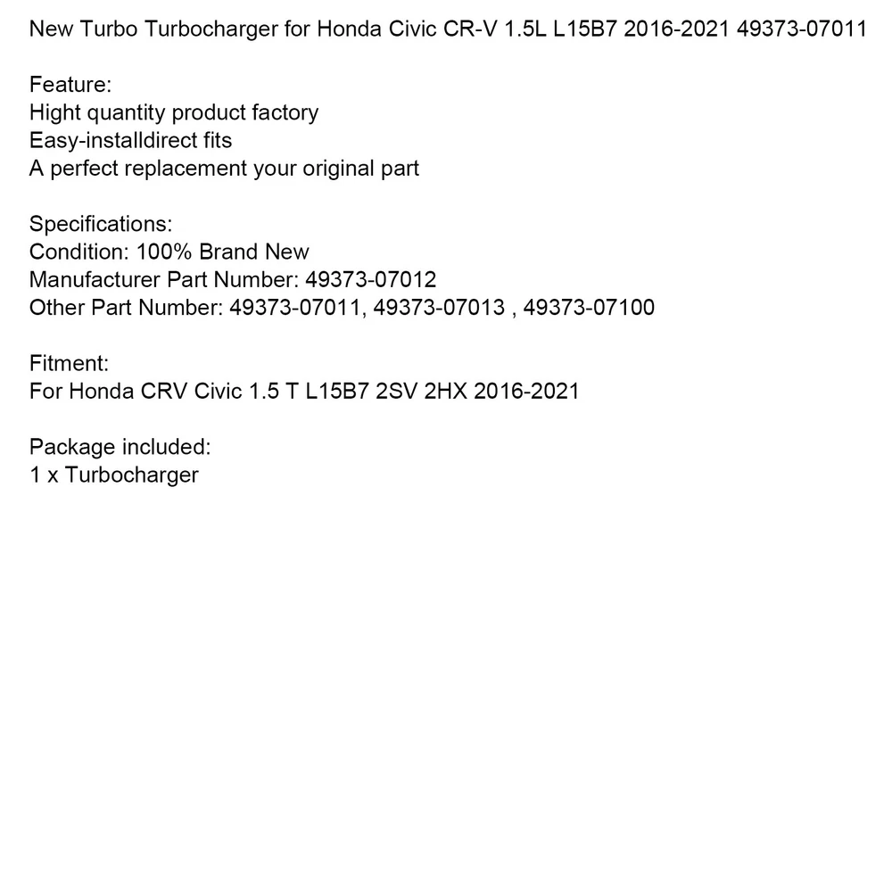 A Fantastic Shop Send us a message Our Store Seller Profile Feedbacks Save this seller Contact New Turbo Turbocharger for Honda Civic CR-V 1.5L L15B7 2016-2021 49373-07011 US New Turbo Turbocharger for Honda Civic CR-V 1.5L L15B7 2016-2021 49373-07011 Feature: Hight quantity product factory Easy-installdirect fits A perfect replacement your original part Specifications: Condition: 100% Brand New Manufacturer Part Number: 49373-07012 Other Part Number: 49373-07011, 49373-07013 , 49373-07100 Fitment: For Honda CRV Civic 1.5 T L15B7 2SV 2HX 2016-2021 Package included: 1 x Turbocharger About US About Our Items We strive to describe all items accurately and thoroughly, with the utmost care and attention to detail. However, to ensure a mutually satisfactory transaction, we kindly ask for your assistance in thoroughly reviewing the item description and photos, and addressing any questions before placing a bid. Customer Satisfaction We stand behind our commitment with exceptional service, a 100% money-back guarantee, and a dedication to customer satisfaction. I am readily available to address any inquiries or concerns you may have, both before and after your purchase. Our aim is to ensure your shopping experience is enjoyable and that you're delighted with your purchase. Feedback Your feedback is crucial to our business's success. If you're satisfied with your purchase and the service you received, we would greatly appreciate your positive feedback, along with an overall Detailed Selling Rating (DSR) of 5. Please take a moment to leave us positive feedback. Our eBay account is set up to automatically reciprocate positive feedback once yours is received. If you're considering leaving neutral/negative feedback or opening an eBay/PayPal case, we encourage you to reach out to us immediately. We're committed to resolving any issues to the best of our ability. Shipping Parcel will be shipped using Standard shipping method. For security purposes, items will be shipped exclusively to the confirmed address on Paypal. Please ensure your Shipping address is up to date before proceeding with payment. Estimated delivery time within the United States ranges from 3 to 10 business days, depending on your location. Returns We accept returns within 60 days from the date the buyer receives the item. If the item is found to be defective upon receipt, the customer has up to 30 days from the date of receipt to request an exchange for a new item or a refund. For returns due to a change of mind, we accept items in their original selling condition. However, if the package has been opened due to a mistaken order, it does not qualify for our return policy. Please note that the buyer is responsible for covering the cost of return postage. If you encounter any issues, please reach out to us via eBay message, and we'll respond within 24 hours.