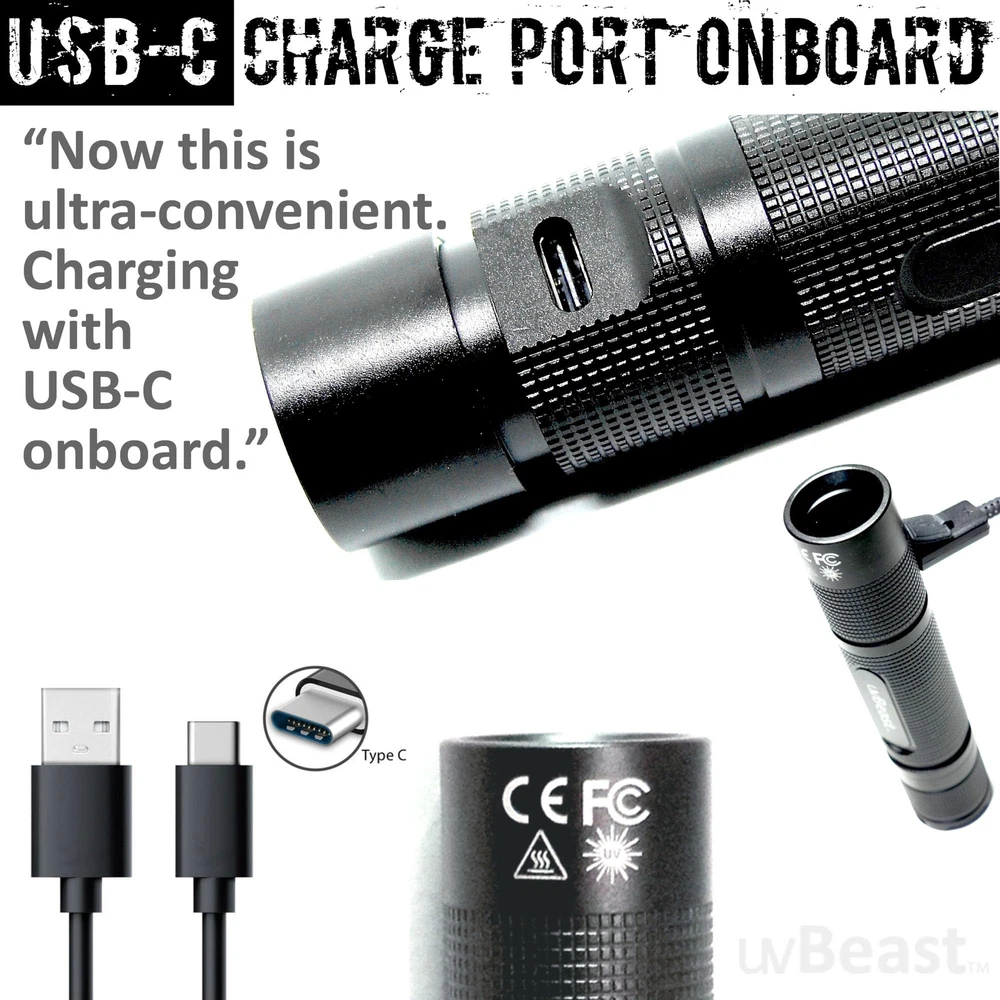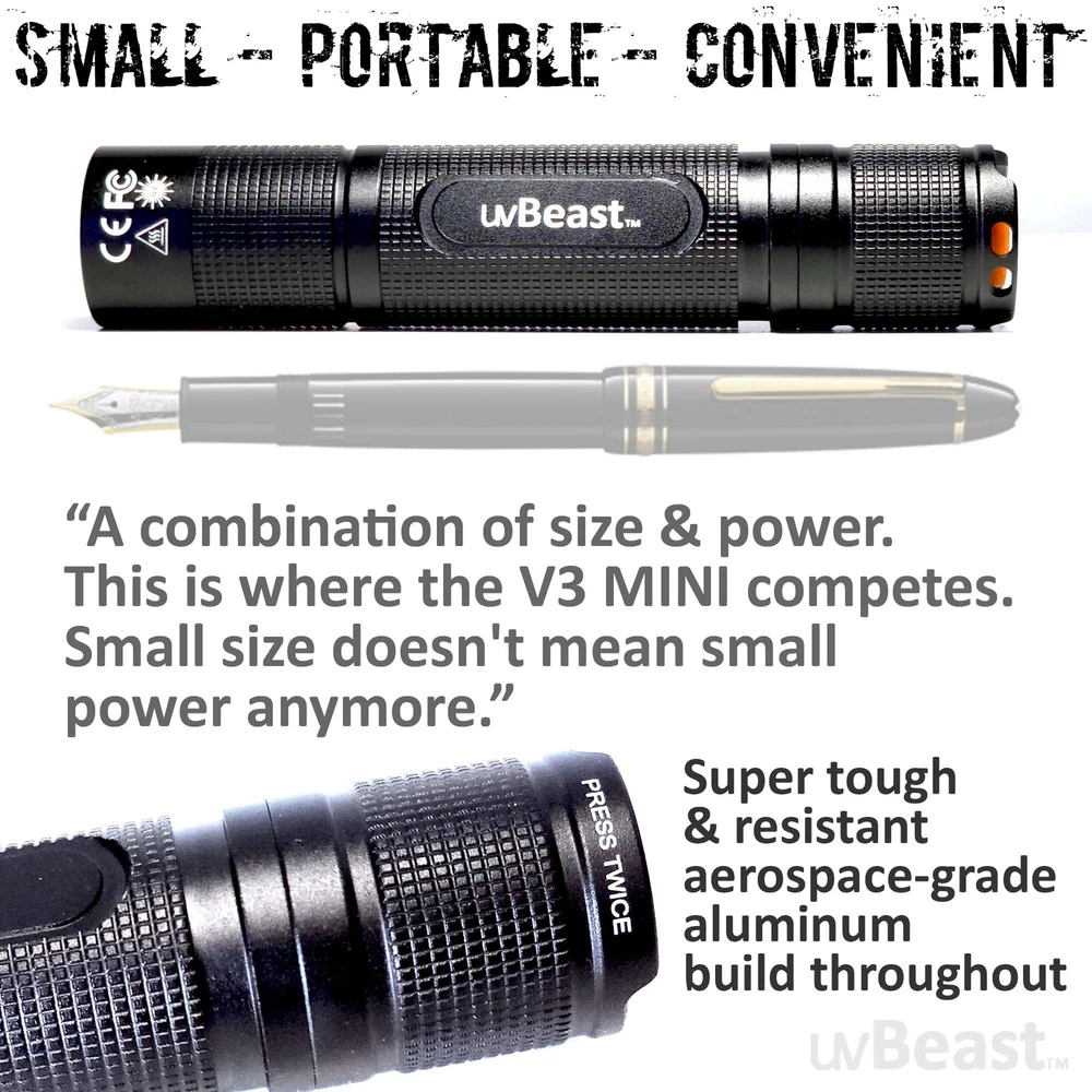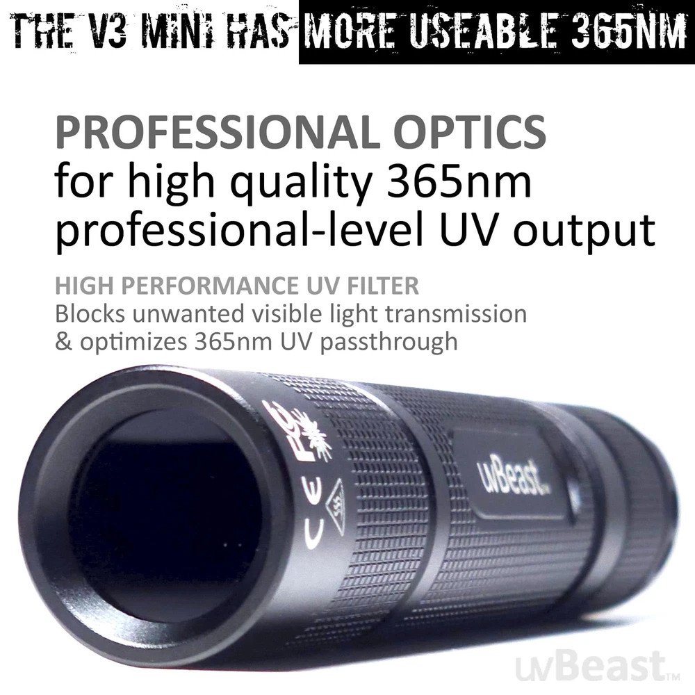 Attention: Double click to turn ON. Switch is not faulty. WHY V3 365nm MINI? Aimed at those who need a smaller more portable device but still want UV power. Using a UV LED from the larger and renowned V3 365nm model, the MINI is a smaller, lighter, convenient package which slips into your pocket but still packs a hefty UV punch! Upgraded features [Oct2023 Ed.]: More UV 365nm power, Wider UV beam, Longer working time, Accidental operation protection UV On A Different Level Entirely. Same high octane yet low contamination UV as the V3 365nm. The viewing quality will really impress you. Filtered 365nm UV is considered as the gold standard sweet spot for UV users. optimized 365nm UV is in a different league, with little visible light leak, which is exactly what you want in a UV light No More Hassle. At last, no-faff charging! Relief. Simply connect the cable to charge. That’s it. Unscrew nothing, remove nothing. No more hunting around for now-where-did-I-put-that-charger, or, turn back-I-forgot-the-charger User-Centered Design. Our R and D people are not sleeping. We talk when we must and shut up and listen to feedback when we need to. We're always moving with innovation and new product developments. This time we enter the fray with size, portability, and convenience with as much optical power we can muster. With user generated wish lists and rigorous user testing, you’re getting a proven and field tested product and avoiding a dud which nobody likes A Convenient Little Package. And it’s ready out-of-the-box. It’s our UV power, and newest UV tech which we’re known for, which combines small size with a big UV payload that you’re looking for. High power UV means better results for you Attention: Double click to turn ON. Switch is not faulty. Prevents accidental operation in your pocket