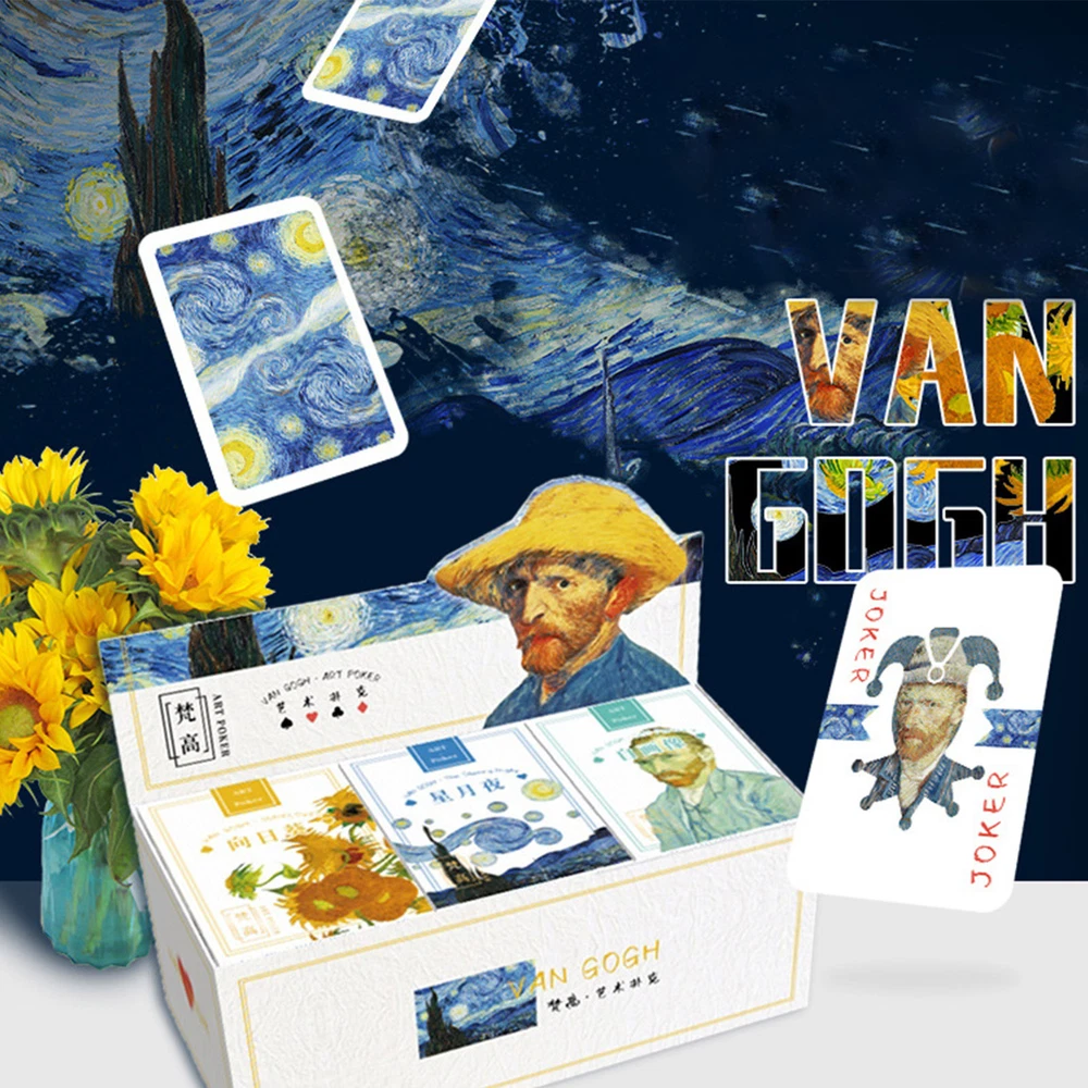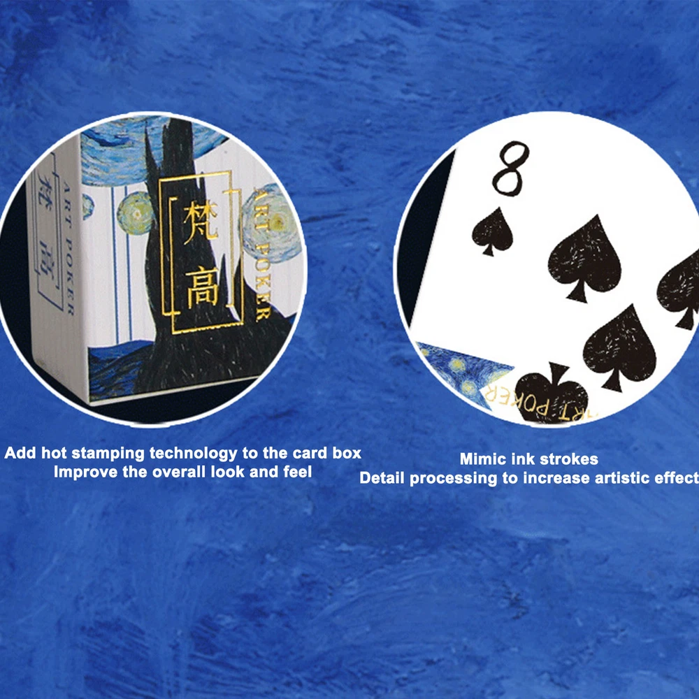 Bullet Points: Description: Made of superior material, and high-quality blue core paper, the card is anti-crease and more resistant to bending. Make you feel extremely comfortable and smooth. Bronzing technology to the brand box improves the overall appearance of the texture. Imitate ink stroke effect to increase the artistic effect of detail processing. Product Attributes: Name: Van Gogh Art Poker Material: paper products Package size: 90MM x 65MM / 3.5*2.6in Card size: 62MM x 87MM / 2.4*3.4in Packing List: 1*Van Gogh Art Poker