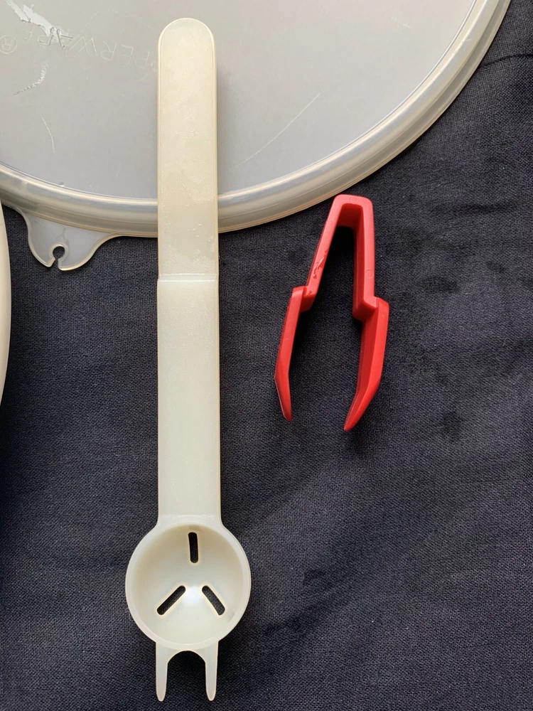 New vintage Tupperware. Comes with the dish, handle, lid, mini tongs and olive/onion spoon. Never used. Was part of my mother’s Tupperware salespersons kit. Kept in a closet for many years. Offers happily considered! Thanks for looking in Granny’s Shop🥰