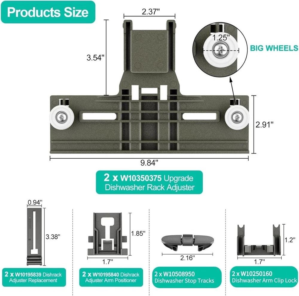 Glorious-2024 DESCRIPTION RETURN POLICY CONTACT US UPGRADED W10350375 Dishwasher Top Rack Adjuster Parts Replacement for Whirlpool Dishwasher Parts WDT730PAHZ0 WDT750SAHZ0 WDTA50SAHZ0 WDT970SAHZ0 Upper Rack Parts,Fits Kenmore Dishwasher Top Rack Parts Product Description: Condition: New Quality:100% Replacement and High Quality, Each Product is tested before shipping and are 100% working. Type: Dishwasher Dishrack Adjuster Part Number: 3516330 W10250159 W10712395 W10712395VP AP5957560 Material: Polymer Compatible Model: For Whirlpool W10350375 Compatible Brand: For Whirlpool About this item [Long-lasting Polymer Materia for Whirlpool Dishwasher Baskets Parts] Our W10350375 whirlpool dishwasher Baskets upper rack adjuster is made of upgraded high quality polymer material, which is more durable and corrosion resistance than other materials. And the wheels on the upper rack parts are held on via metal screws. These upgrades make dishwasher rack replacement more sturdy and durable, and will not easily melt and disintegrate due to normal use and heat. 【Perfect Dishwasher Replacement 】 ①W10350375 whirlpool dishwasher baskets parts replaces 3516330, W10250159,W10712395, W10712395VP, AP5957560, PS10065979, W10712395VP. ② W10195840 Dishwasher Positioner Replaces1872228, AH3407016, EA3407016,etc. ③ W10195839 Dishwasher Rack Adjuster Replaces: WPW10195839, AP6016799, PS11750092. ④ W10508950 Dishwasher Stop Track Replaces: 8562015, W10199682, 2684662, AP6022472, PS11755805,etc ⑤W10250160 dishwasher adjuster arm clip lock replaces WPW10250160, AP6017800, PS11751100. 【Great Compatibility, Fit Like the Original】 W10350375 Dishwasher baskets top rack parts adjuster kit Compatible with Whirlpool, KitchenAid, Kenmore and others dishwasher replacement rack models. Fits following dishwasher model: WDT730PAHZ0, WDT750SAHZ0, WDTA50SAHZ0, WDT730PAHZ0, WDT780SAEM2, WDT970SAHZ0, WDT780SAEM1665.12763K313, 665.13409N413, 665.14703N511, 665.14542N711, 665.14529N611, 665.14569N610, KDFE454CSS4, KUDC10IBSS0, KUDC10FBWH0, KUDE20FBWH0, KUDC10IBBL0, KUDE20FBBL1, KUDE20FBSS0, etc. 【Easy Installation-Perfect Dishwasher Parts】 These W10350375 dishwasher baskets parts whirlpool top rack replacement adjuster kit are able to fixes symptoms: ①dishwasher not washing properly; ②dishrack will not pull out or push in; ③dishrack is not level;④upper dish rack cant fix and other etc.Item is easy to remove and replace,search for "W10350375" on the YouTube to get the installation video and it shows you exactly how to installation. 【Package & Warranty】 Package Contents: 2 x W10350375 Dishwasher Baskets Upper Rack Adjusters, 2 x W10195840 Dishwasher Positioners,2 x W10195839 Rack Adjusters,2 x W10508950 Stop Tracks. 2 x W10250160 Dishwasher Baskets Adjuster Arm Clip-lock. 2 x Placemats. This dishwasher baskets adjuster kit not include dishwashing adjuster housing. If you want purchse the Dishwasher Dishrack Adjuster Housing, please search the below ASIN[B0CLV9G3FF] [B0CLV9G3FF]. 1-Year Guarantee--Please contact us at any time if the there is any problem in the product, damaged or not fit. We provide full after-sales service and will try our best to solve the problem. [Compatible with Kenmore Dishwasher Top Rack Models] Luckman's upgraded w10350375 dishwasher top rack adjuster fit Kenmore dishwasher top rack parts model 665.13209N410, 665 13209n412, 665.13223n412, 665.13223n413, 665.13269k112, 665.13269K113, 665.13269k114, 665.13542N410, 665.13542n412, 665.13543n410, 665.13543n410 , 665.13543n412, 665.13693n411, 665.14573n612, 665.14759n512; Fit KitchenAid dishwasher parts upper rack models KDFE454CSS2, KDFE454CSS3, KDFE454CSS4, KDFE454CSS5, KUDC10FBBL0, KUDC10FBSS0, KUDC10FBWH0, KUDC10IBBL0, KUDC10IBSS0, KUDC10IBWH0, KUDE20FBBL0, KUDE20FBSS0, KUDE20FBWH0. Dishwasher Baskets Top Rack Replacement Parts NumberW10350375 Replaces Part Numbers: W10350375 , W10250159 , W10712395 , W10712395VP,AP5957560,PS10065979,W10712395VP. W10195840 Dishwasher Positioner Replaces Part Numbers: 1872228, AH3407016, EA3407016, PS3407016, WPW10195840, LP16233. W10195839 Dishwasher Rack Adjuster Replaces Part Numbers: WPW10195839, AP6016799, PS11750092. W10508950 Dishwasher Stop Track Replaces Part Numbers : W10508950, 8562015, W10199682, 2684662, AP6022472, PS11755805, EAP11755805, PD00004770.W10250160 dishwasher adjuster arm clip lock replaces : WPW10250160,AP6017800,PS11751100. Compatible with Whirlpool Dishwasher Model: 7WDT950SAYM0 7WDT950SAYM1 7WDT950SAYM2 7WDT950SAYM3 WDF590SAJB0 WDF590SAJM0 WDF590SAJW0 WDT730PAHB0 WDT730PAHV0 WDT730PAHW0 WDT730PAHZ0 WDT750SAHW0 WDT750SAHZ0 WDT780SAEM0 WDT780SAEM1 WDT780SAEM2 WDT790SLYB0 WDT790SLYM0 WDT790SLYM1 WDT790SLYM2 WDT790SLYM3 WDT790SLYW0 WDT790SLYW2 WDT910SAYE0 WDT910SAYE1 WDT910SAYE2 WDT910SAYE3 WDT910SAYH0 WDT910SAYH1 WDT910SAYH2 WDT910SAYH3 WDT910SAYM0 WDT910SAYM1 WDT910SAYM2 WDT910SAYM3 WDT910SSYB0 WDT910SSYB1 WDT910SSYB2 WDT910SSYB3 WDT910SSYM0 WDT910SSYM1 WDT910SSYM2 WDT910SSYM3 WDT910SSYW0 WDT910SSYW1 WDT910SSYW2 WDT910SSYW3 WDT970SAHB0 WDT970SAHV0 WDT970SAHW0 WDT970SAHZ0 WDT975SAHV0 WDT975SAHZ0 WDTA50SAHB0 WDTA50SAHN0 WDTA50SAHZ0 WDTA75SAHN0 WDTA75SAHZ0 Compatible with Kenmore Dishwasher Model: 221.3222N414 221.3223N414 221.3229N414 221.4523N611 221.4545N711 221.4573N612 221.4743N513665.12762K312 665.12762K313 665.12762K314 665.12763K312 665.12763K313 665.12763K314 665.12769K312 665.12769K313 665.12769K314 665.12772K312 665.12772K313 665.12772K314 665.12773K312 665.12773K313 665.12773K314 665.12774K312 665.12774K313 665.12774K314 665.12776K312 665.12776K314 665.12776K315 665.12779K312 665.12779K313 665.12779K314 665.12813K313 665.13042K110 665.13043K110 665.13044K110 665.13049K110 665.13202N410 665.13202N411 665.13202N412 665.13202N413 665.13203N410 665.13203N411 665.13203N412 665.13203N413 665.13204N410 665.13204N411 665.13204N412 665.13204N413 665.13209N410 665.13209N411 665.13209N412 665.13209N413 665.13222N410 665.13222N411 665.13222N412 665.13222N413 665.13222N414 665