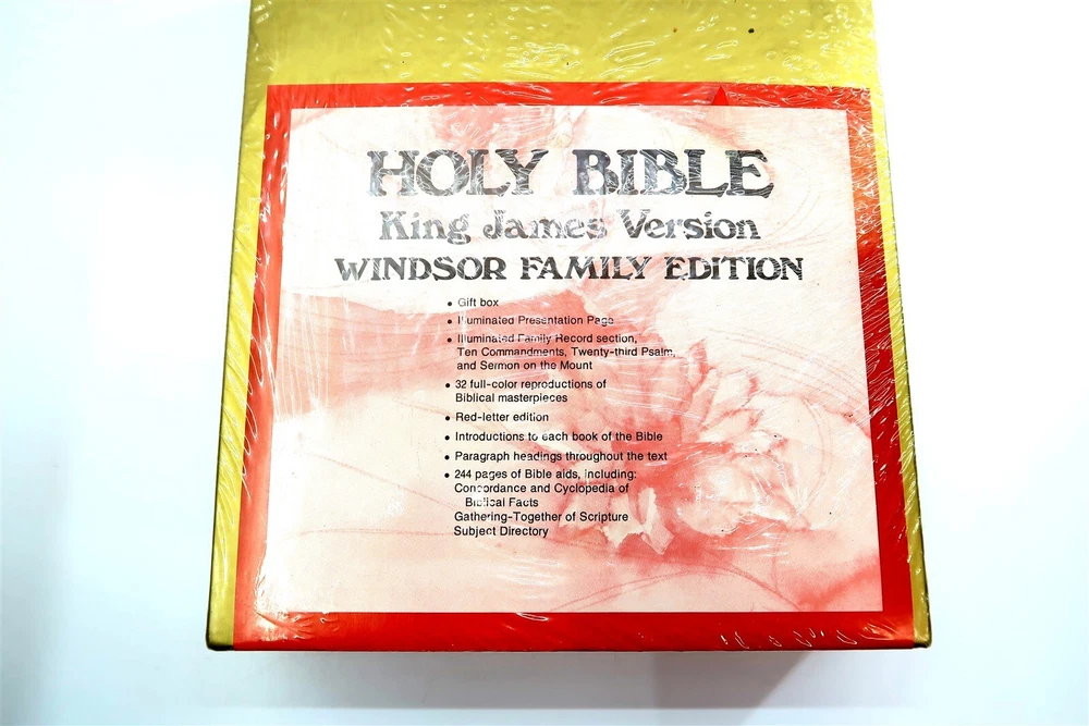 New WINDSOR FAMILY HOLY BIBLE King James Edition 1128 Gilt Pages FACTORY SEALED This eBay listing is for a vintage New Old Stock (NOS) Windsor Family Bible King James Edition that comes still factory sealed in plastic and never opened up before. This is a full sized bible at 11.5" tall, 1128 pages, 6.3 pounds and looks to be bound in leather but since it's sealed - I can't touch it to see if it's real leather or faux leather. Age is unknown but I believe it's from the early 1970's to 1980's era. Seller Location Reference - Loft/Box 300D BID IN CONFIDENCE – CHECK MY FEEDBACK! My goal is your satisfaction. I leave positive feedback right after the payment is received for all orders!! If you plan to leave anything less than positive feedback and 5 stars - please let me know so that I can work out any problems that you may have. I aim to please!! SHIPPING & HANDLING FOR US BIDDERS We ship ASAP upon payment as noted above within 1 business day 99% of the time!! We normally pack up your new treasures 2 - 3 times a day and ship using USPS and Fedex Ground so that you get your items in a timely fashion. As always - there is no charge for local pickup on any of my items!! SHIPPING AND HANDLING FOR INTERNATIONAL BIDDERS Import duties, taxes and charges are not included in the item price or shipping charges. These charges are the buyer’s responsibility. Please check with your country’s customs office to determine what these additional costs will be prior to bidding/buying.” THANK YOU AND HAVE A WONDERFUL DAY!! Powered by SixBit's eCommerce Solution