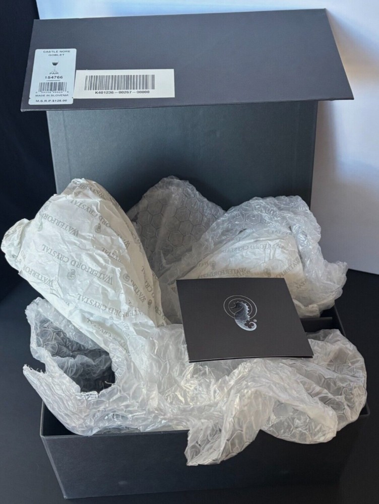 Elevate your dining experience with the sophistication of Waterford Castle Nor'e glassware. This set includes two exquisite goblets, crafted with the utmost precision and care. The clear glass material showcases your favorite beverages with a touch of elegance, making every sip a memorable occasion. These original Waterford pieces, model number 154766, come in their pristine, original box, ensuring they remain a cherished addition to your collection or a thoughtful gift for someone special. With their classic design and exceptional quality, these goblets are a timeless choice for any gathering or intimate dinner.