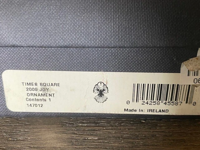 New in the box WATERFORD Crystal 2009 JOY Ornament The Times Square Ball Collection Celebrating 100 Years. There is a small brochure included in the box and it reads 2nd edition Joy There is also an inscription on the bottom of this ornament that reads 100 Years Times Square 2009. TIt is 3 5/8" tall and 2" wide Has a gray satin ribbon for hanging and on the ribbon is Waterford Times Square 2009 Listing and template services provided by inkFrog