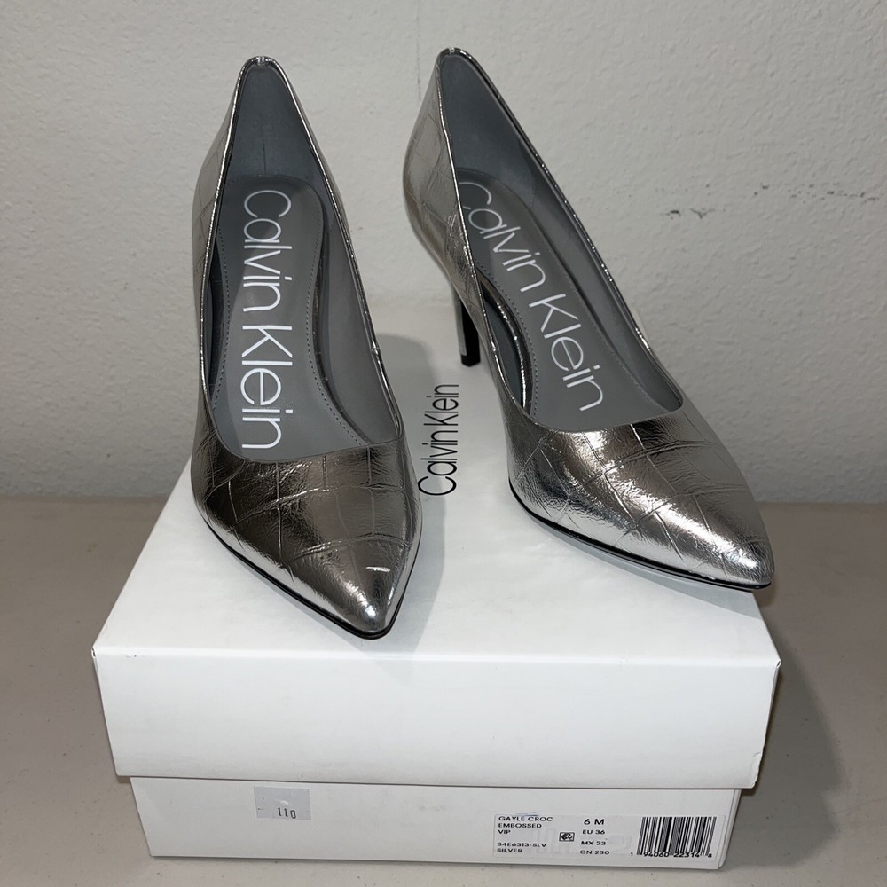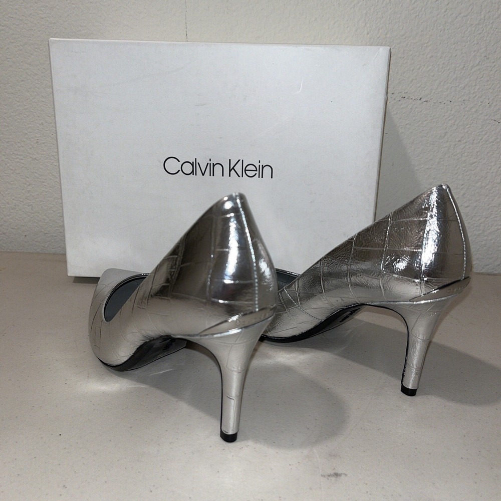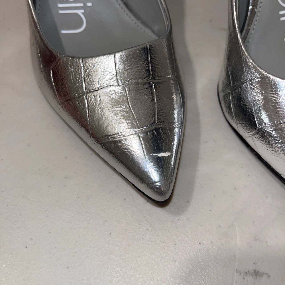 New W/box CALVIN KLEIN Women Silver Croc Gel Pod Gayle Stiletto Slip On Pumps 6M is in excellent new condition but is a little bit dirty (is not a scratch) looks like is a water paint but I don’t want to put any liquid solution on it because I don’t know if the shoe paint will be ok please check the pictures carefully for better look No returns refund or cancel orders sold as is thanks