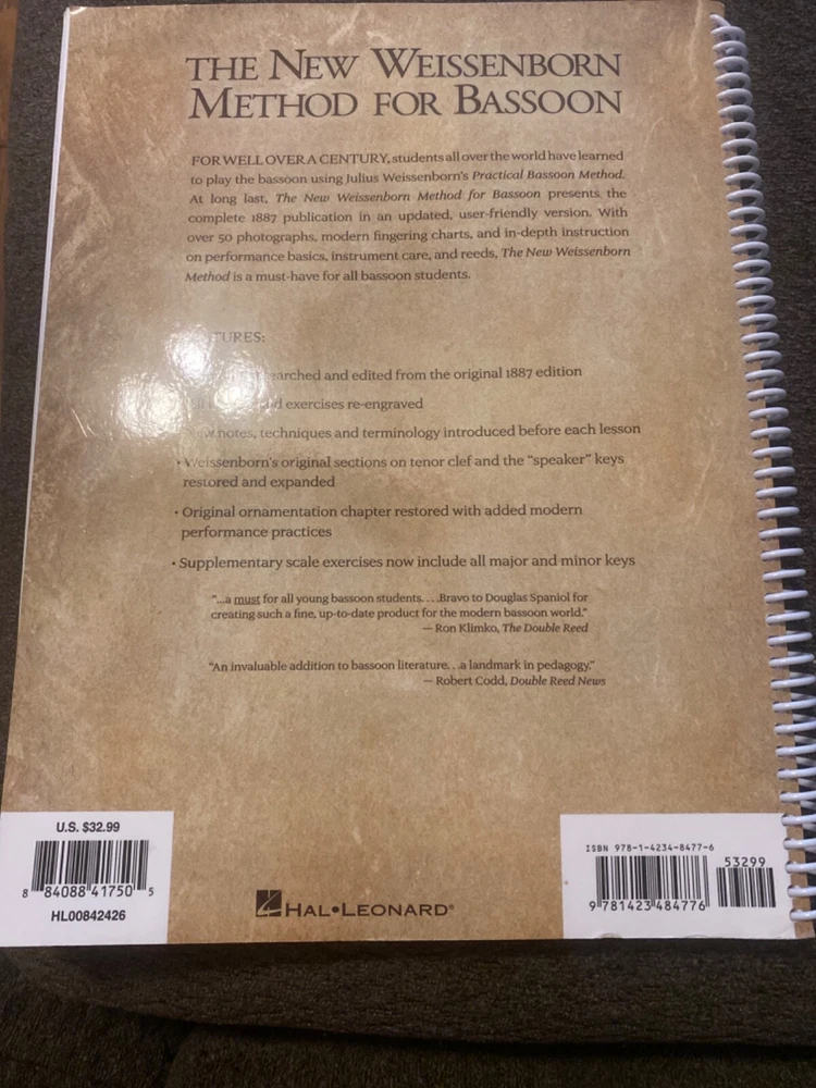 This spiral-bound book is a must-have for any bassoonist looking to improve their playing skills. Written by Douglas Spaniol, the book covers a range of topics including instruction and study on the general use of musical instruments, specifically woodwinds. Published by Leonard Corporation in 2010, the book is 180 pages long and measures 12 inches in length, 9 inches in width, and 0.4 inches in height.The book is written in English and is perfect for those interested in the Weissenborn method for bassoon. It includes step-by-step instructions and exercises to help students master the instrument. This book is a great addition to any musician's library and is sure to provide hours of practice and improvement.