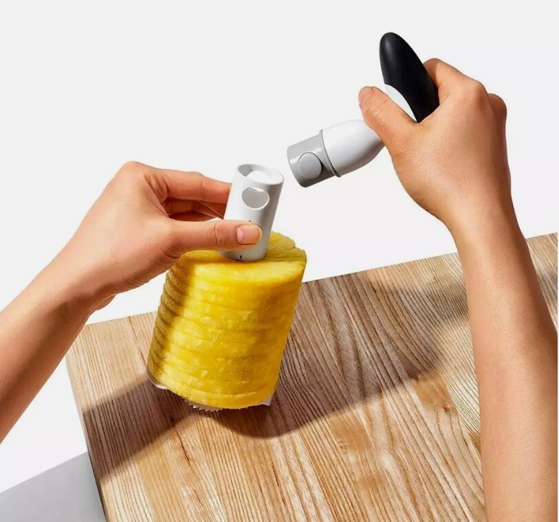 The OXO Good Grips Ratcheting Pineapple Slicer is a great tool to use to slice up pineapple quickly & safely. Simply slice off the top of a fresh pineapple, then twist the Slicer onto the exposed fruit to create perfect pineapple rings. The ergonomic Ratcheting handle is easy on arms & wrists. Measurement markings let you gauge a pineapple's height before slicing so you know when you're nearing the bottom of the fruit. For more than three decades, OXO has made tools that delight & exceed expectations, making OXO a favourite for a generation. Dimensions: L30.4 x W12 x H4.4cm Colour: White with Black & Grey trim BPA free Measurement markings let you gauge a pineapple's height E rgonomic Ratcheting handle is easy on arms & wrists Non-slip grip Adjustable height for different sized pineapples Dishwasher safe First 5 are stock photos; last 2 are photos of actual item