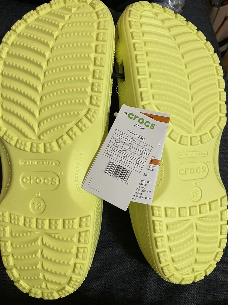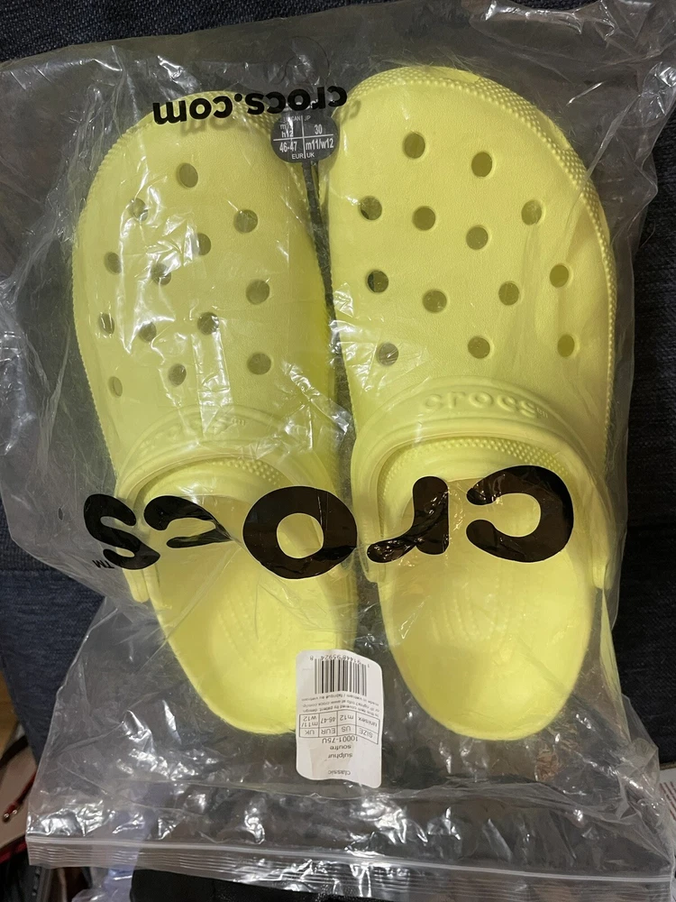 The New With Tag Crocs Classic CrocBand Yellow Comfort Sandals are unisex sandals in size M12. These Crocs feature a classic design with a bright yellow color, offering both style and comfort for men and women. The CrocBand detailing adds a touch of uniqueness to these sandals, making them a versatile and practical choice for everyday wear.