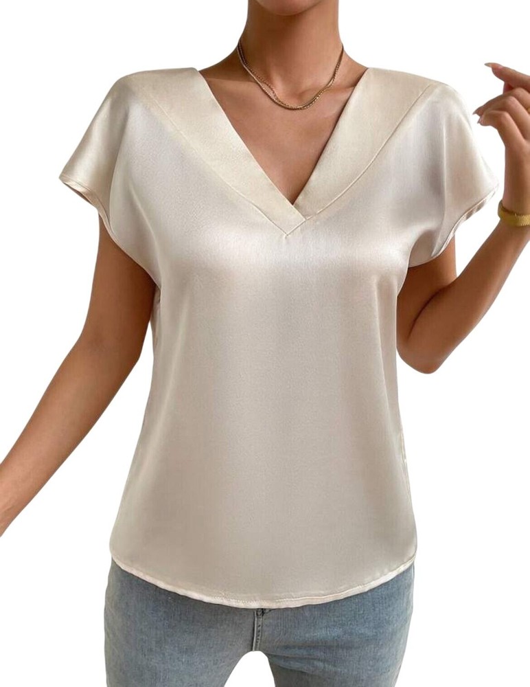 New Woman Glamours Champagne V Neck Blouse Batwing Sleeve Exude elegance with this Glamour's Champagne V Neck Blouse. The batwing sleeves and plunging neckline add a touch of sophistication, perfect for any occasion. • V Neckline for a flattering silhouette • Batwing sleeves for a unique style • Champagne color for a touch of elegance • Suitable for any occasion