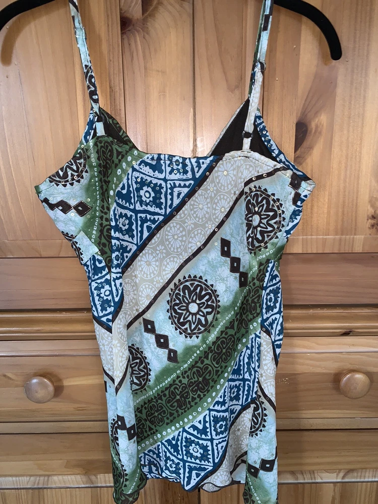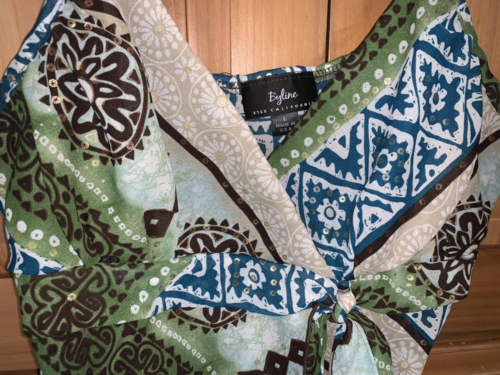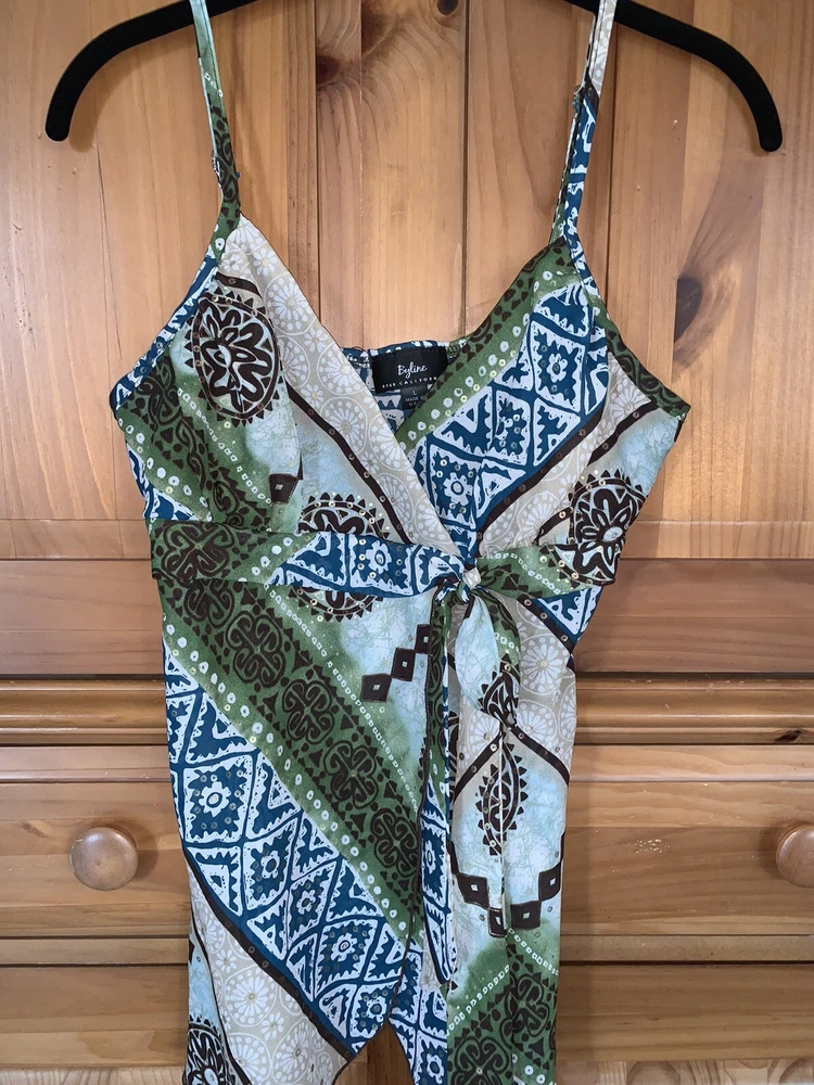 NEW Without Tags Womens Byline Byers California Abstract Print Camisole Size Large (runs small). Cross-over neckline and below bust with empire waist seam. Lined slightly gathered cups Off set tie at bust seam that can knotted or made into a small bow. Tiny gold foil dots accents. Adjustable thin straps. Small mark on inner tie (not visible) Bust 34" Length 26" from shoulder CHECK MY OTHER LISTINGS FOR MORE GREAT DEALS