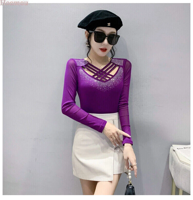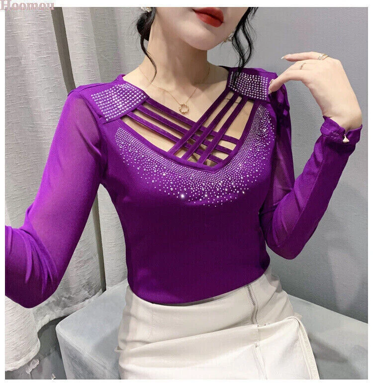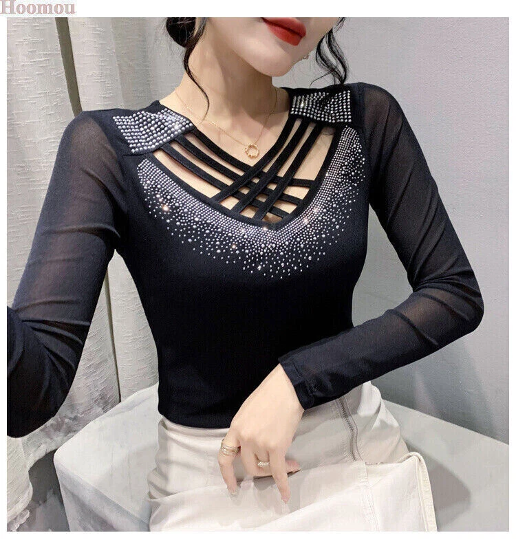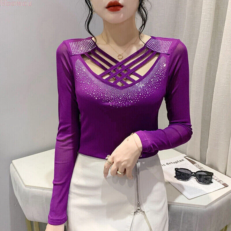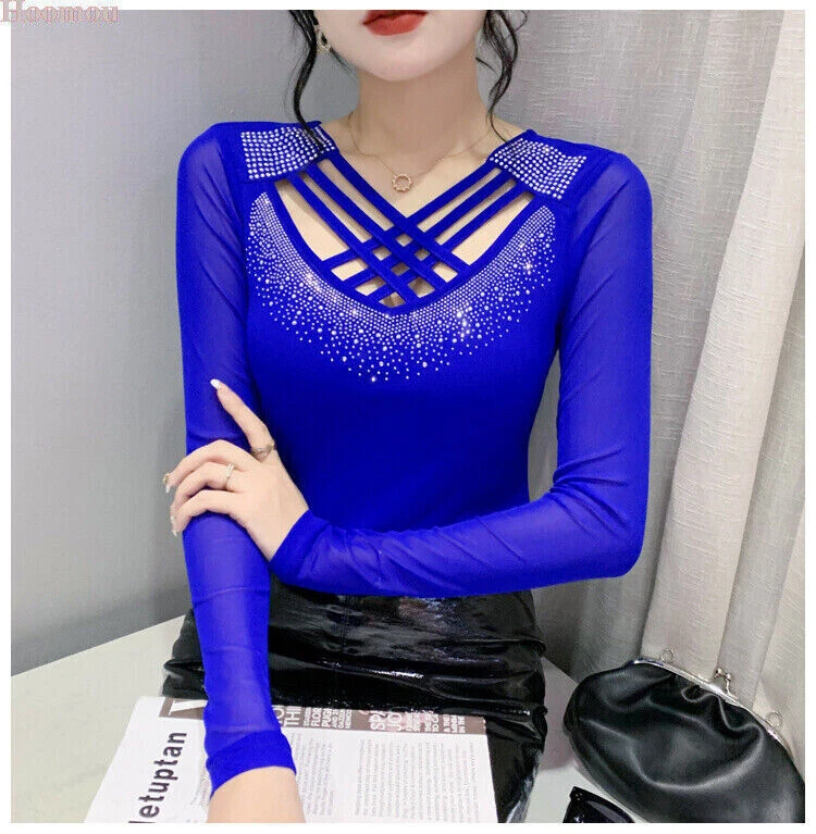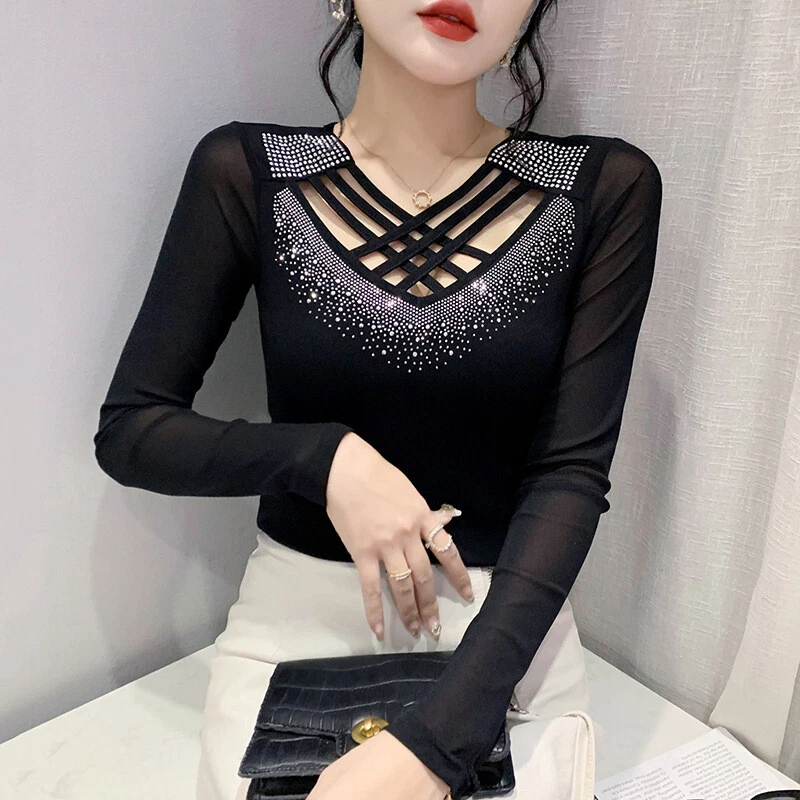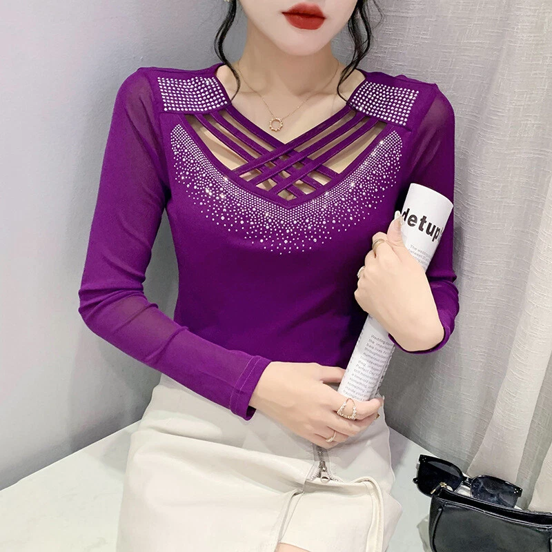 Neckline: V-Neck Occasion: Party/Cocktail, Casual, Formal, Business, Workwear Style: Basic Country/Region of Manufacture: China Sleeve Type: Classic/Fitted Sleeve Fabric Type: Mesh Closure: Pullover Fit: Regular Size Type: Regular Pattern: Solid Department: Women Sleeve Length: Long Sleeve Brand: Unbranded Vintage: No Accents: Rhinestone, Strap Theme: Korean, Elegant, Classic, Designer, Western, Modern, 70s, 80s, 90s, Novelty Type: Blouse Material: Polyester Graphic Print: No Features: Easy Care, Soft, Comfortable, Breathable, Moisture Wicking, Slimming Personalize: No Season: Fall, Spring, Winter Garment Care: Machine Washable