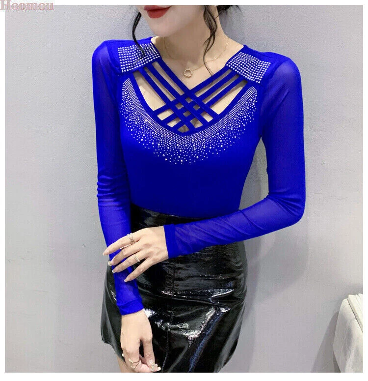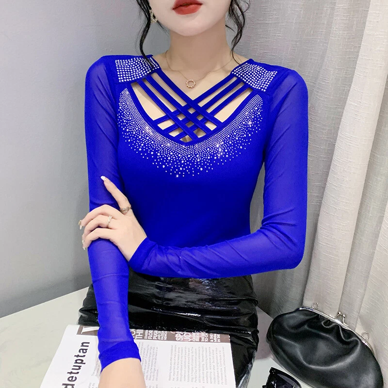 New Womens Rhinestone Cross Strap Mesh Slim Cocktail Party Blouse Western Tops