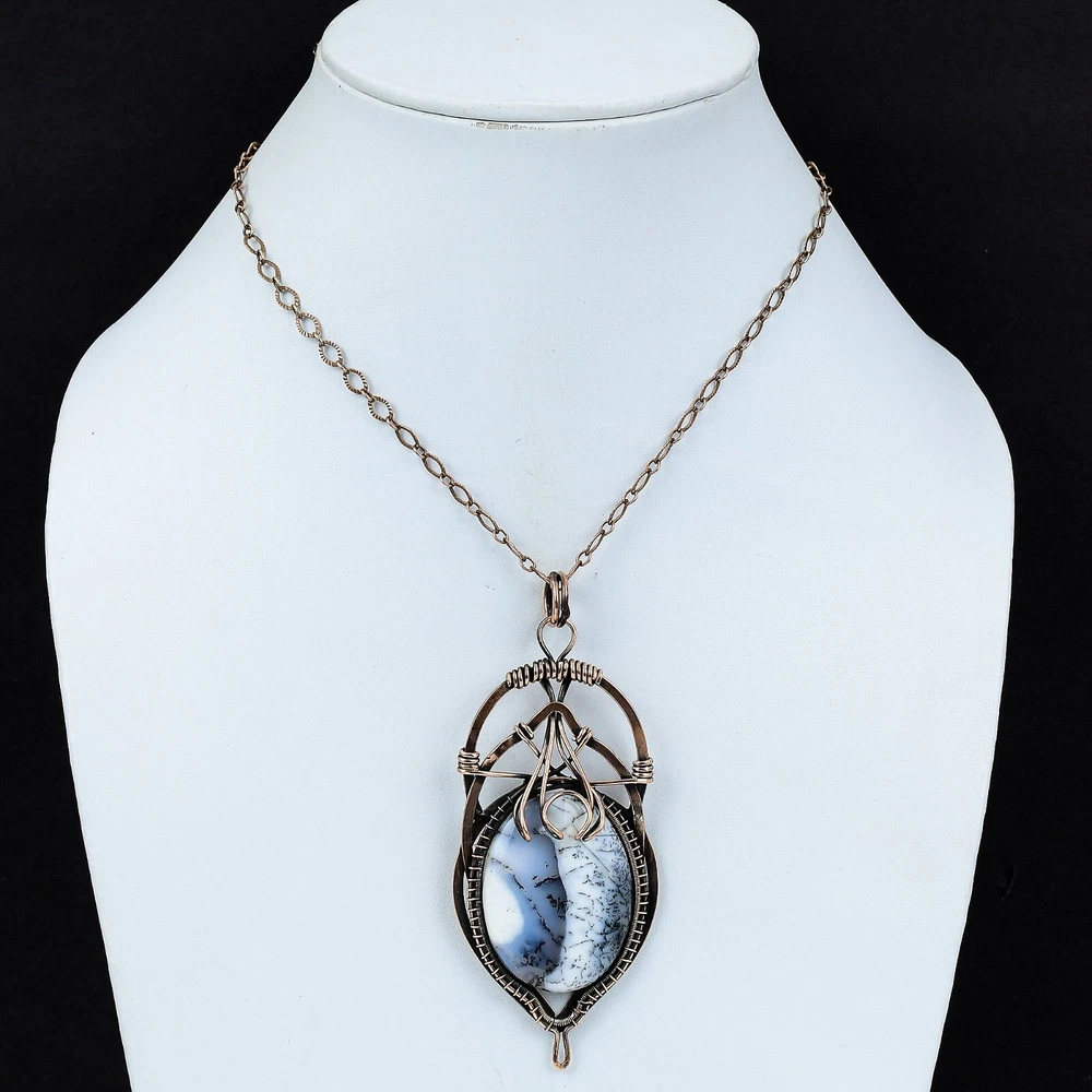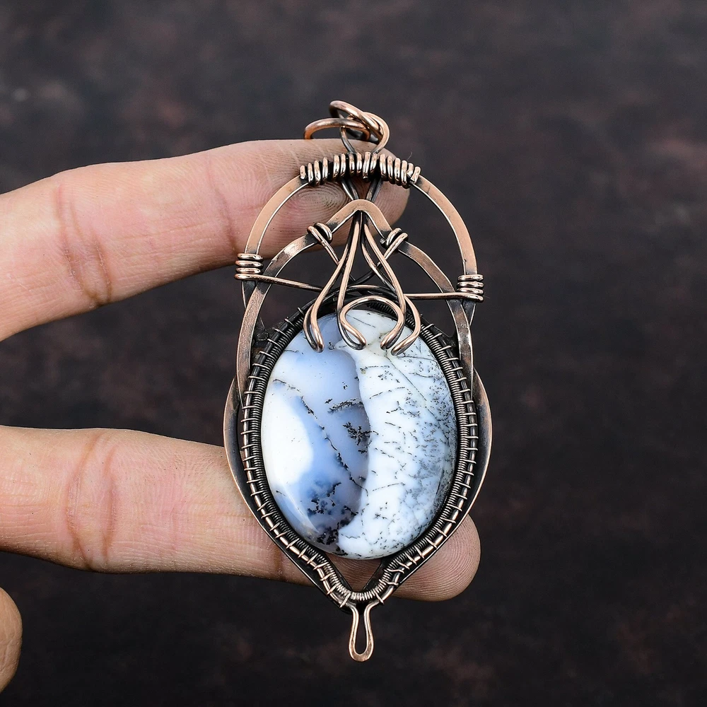 Note : Due to the natural formation of this gemstone. Slight variation in design and color are to be expected. Welcome to Silver Creation Handmade Pendant, Wire Wrapped Pendant, Wire Wrapped Jewelry, Copper Pendant, Copper Wire Pendant, Wrapped Jewelry, Wire Wrap Pendant, Wire Wrap Jewelry SKU : VFWP-2368 Gemstone : Dendrite Opal Stone Shape : Oval Metal Purity : Unknown Copper Length : 98 Millimetres Width : 42 Millimetres Copper has been used for jewelry making for thousands of years, dating back to ancient civilizations such as the Egyptians, Romans, and Aztecs. Copper was valued for its beauty, versatility, and durability, and was often used to make everything from jewelry and coins to cookware and tools. In addition to its historical significance, copper jewelry also offers several benefits. Copper is a natural conductor of heat and electricity, which makes it ideal for energy healing and therapeutic purposes. Wearing copper jewelry is believed to have various health benefits, such as improving circulation, reducing inflammation, and boosting the immune system. Some people also believe that copper jewelry has the ability to balance energy and improve mood. For Mother's Day Gift For Father's Day Gift For Promise For Valentine' Day For Halloween Party For Christmas Day Gift For New Year Party For Mom For Her If you can't find the information you need or need some advice for your design? Feel free to contact us. We are fast to reply :) All our work is made by hand with Love and Care in our workshop Thank you so much for visiting and hope you enjoy shopping with us Silvercreations is committed to delivering the best quality sterling silver jewelry to customers. As a handmade jewelry manufacturer, we offer an extensive selection of copper gemstone jewelry that showcases the brilliance of our craftsmanship. We are an experienced handmade jewelry supplier with expertise in embellishing gemstones to suit every style. We offer you the liberty to create your jewelry ensemble with sparkling, earthy, and pure gemstones. Our Talented artisans masterfully handcraft each piece of jewelry you see here. Our pieces are made with genuine gemstones.