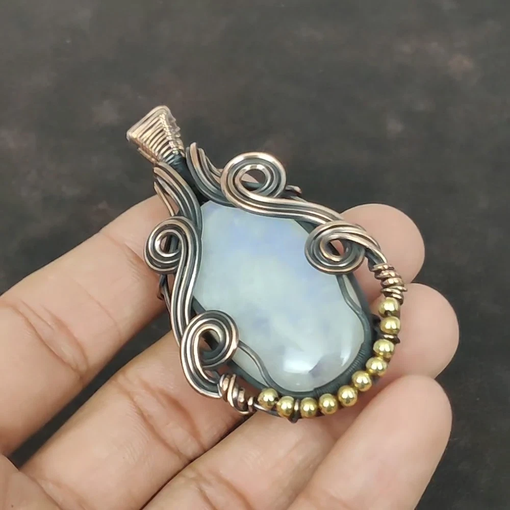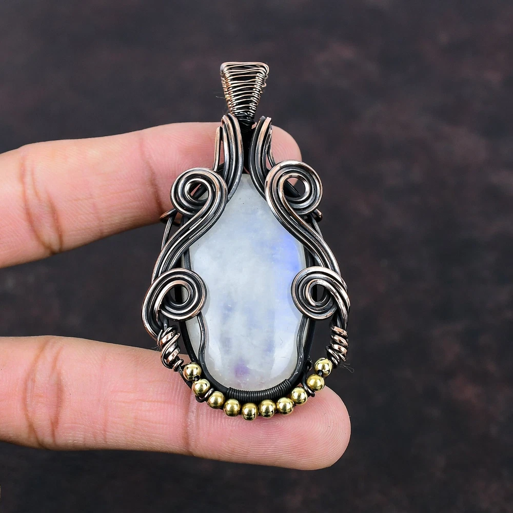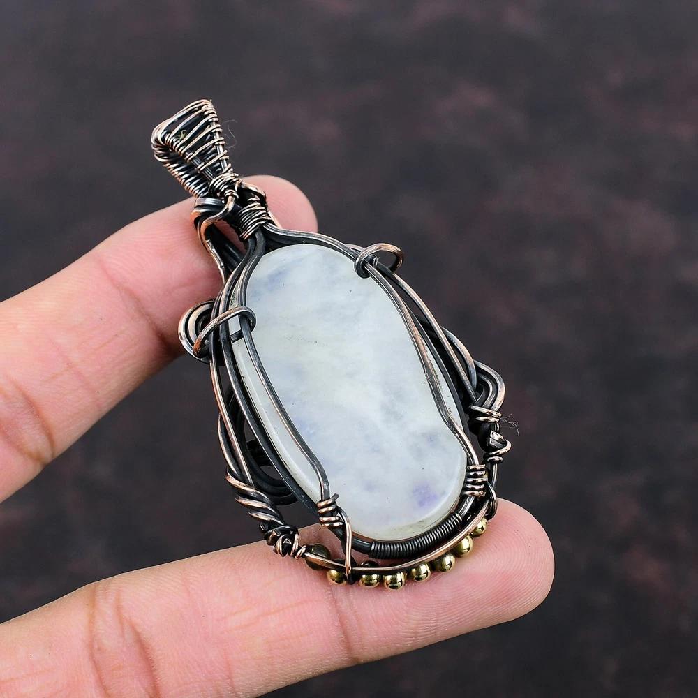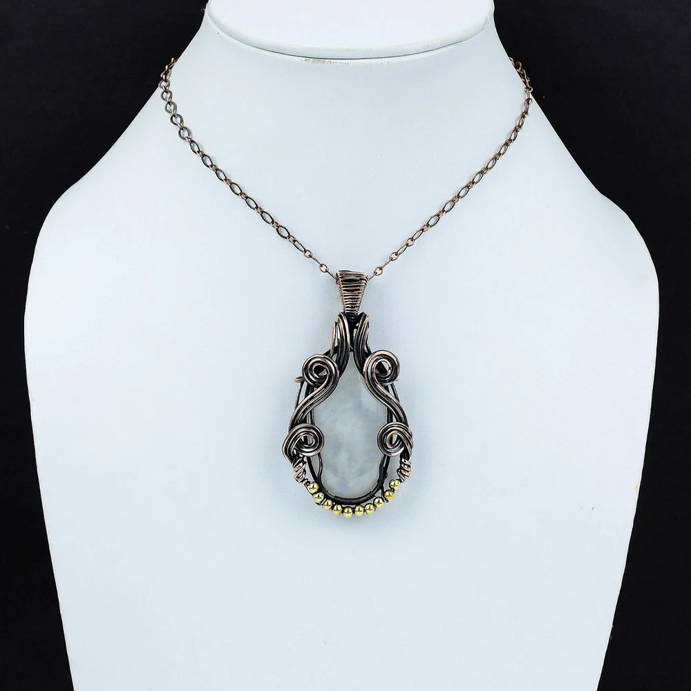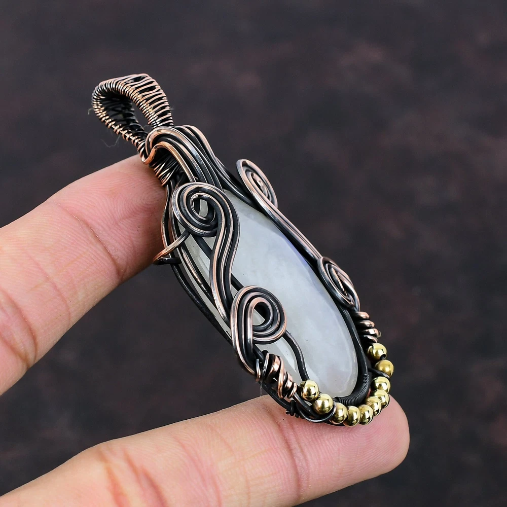 Note : Due to the natural formation of this gemstone. Slight variation in design and color are to be expected. Welcome to Silver Creation Handmade Pendant, Wire Wrapped Pendant, Wire Wrapped Jewelry, Copper Pendant, Copper Wire Pendant, Wrapped Jewelry, Wire Wrap Pendant, Wire Wrap Jewelry SKU : VFWP-3754 Gemstone : Rainbow Moonstone Stone Shape : Oval Metal Purity : Unknown Copper Length : 74 Millimetres Width : 40 Millimetres Copper has been used for jewelry making for thousands of years, dating back to ancient civilizations such as the Egyptians, Romans, and Aztecs. Copper was valued for its beauty, versatility, and durability, and was often used to make everything from jewelry and coins to cookware and tools. In addition to its historical significance, copper jewelry also offers several benefits. Copper is a natural conductor of heat and electricity, which makes it ideal for energy healing and therapeutic purposes. Wearing copper jewelry is believed to have various health benefits, such as improving circulation, reducing inflammation, and boosting the immune system. Some people also believe that copper jewelry has the ability to balance energy and improve mood. For Mother's Day Gift For Father's Day Gift For Promise For Valentine' Day For Halloween Party For Christmas Day Gift For New Year Party For Mom For Her If you can't find the information you need or need some advice for your design? Feel free to contact us. We are fast to reply :) All our work is made by hand with Love and Care in our workshop Thank you so much for visiting and hope you enjoy shopping with us Silvercreations is committed to delivering the best quality sterling silver jewelry to customers. As a handmade jewelry manufacturer, we offer an extensive selection of copper gemstone jewelry that showcases the brilliance of our craftsmanship. We are an experienced handmade jewelry supplier with expertise in embellishing gemstones to suit every style. We offer you the liberty to create your jewelry ensemble with sparkling, earthy, and pure gemstones. Our Talented artisans masterfully handcraft each piece of jewelry you see here. Our pieces are made with genuine gemstones.
