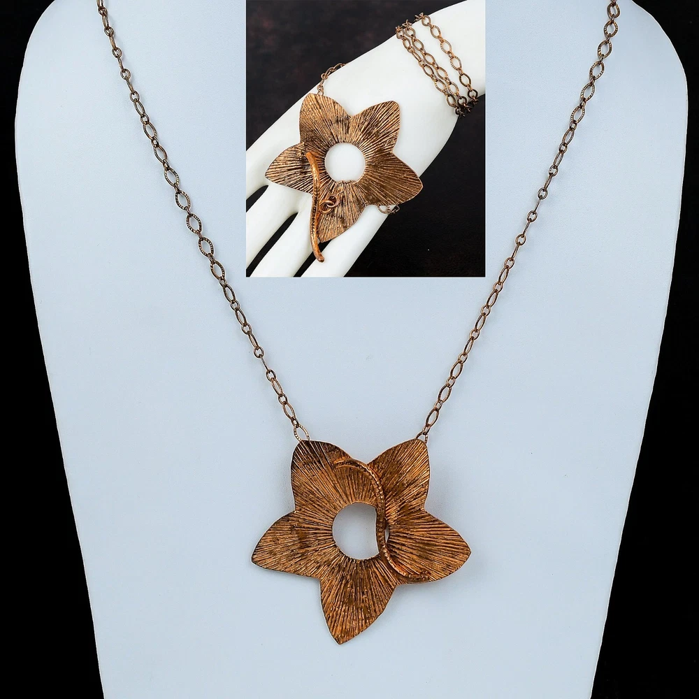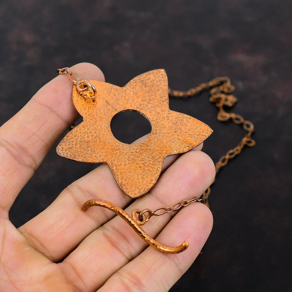 Note : Due to the natural formation of this gemstone. Slight variation in design and color are to be expected. Welcome to Silver Creation Handmade Pendant, Wire Wrapped Pendant, Wire Wrapped Jewelry, Copper Pendant, Copper Wire Pendant, Wrapped Jewelry, Wire Wrap Pendant, Wire Wrap Jewelry SKU : VWP-7 Gemstone : Stone Shape : As Seen In Picture Metal Purity : Unknown Copper Length : 55 Millimetres Width : 60 Millimetres Copper has been used for jewelry making for thousands of years, dating back to ancient civilizations such as the Egyptians, Romans, and Aztecs. Copper was valued for its beauty, versatility, and durability, and was often used to make everything from jewelry and coins to cookware and tools. In addition to its historical significance, copper jewelry also offers several benefits. Copper is a natural conductor of heat and electricity, which makes it ideal for energy healing and therapeutic purposes. Wearing copper jewelry is believed to have various health benefits, such as improving circulation, reducing inflammation, and boosting the immune system. Some people also believe that copper jewelry has the ability to balance energy and improve mood. For Mother's Day Gift For Father's Day Gift For Promise For Valentine' Day For Halloween Party For Christmas Day Gift For New Year Party For Mom For Her If you can't find the information you need or need some advice for your design? Feel free to contact us. We are fast to reply :) All our work is made by hand with Love and Care in our workshop Thank you so much for visiting and hope you enjoy shopping with us Silvercreations is committed to delivering the best quality sterling silver jewelry to customers. As a handmade jewelry manufacturer, we offer an extensive selection of copper gemstone jewelry that showcases the brilliance of our craftsmanship. We are an experienced handmade jewelry supplier with expertise in embellishing gemstones to suit every style. We offer you the liberty to create your jewelry ensemble with sparkling, earthy, and pure gemstones. Our Talented artisans masterfully handcraft each piece of jewelry you see here. Our pieces are made with genuine gemstones.