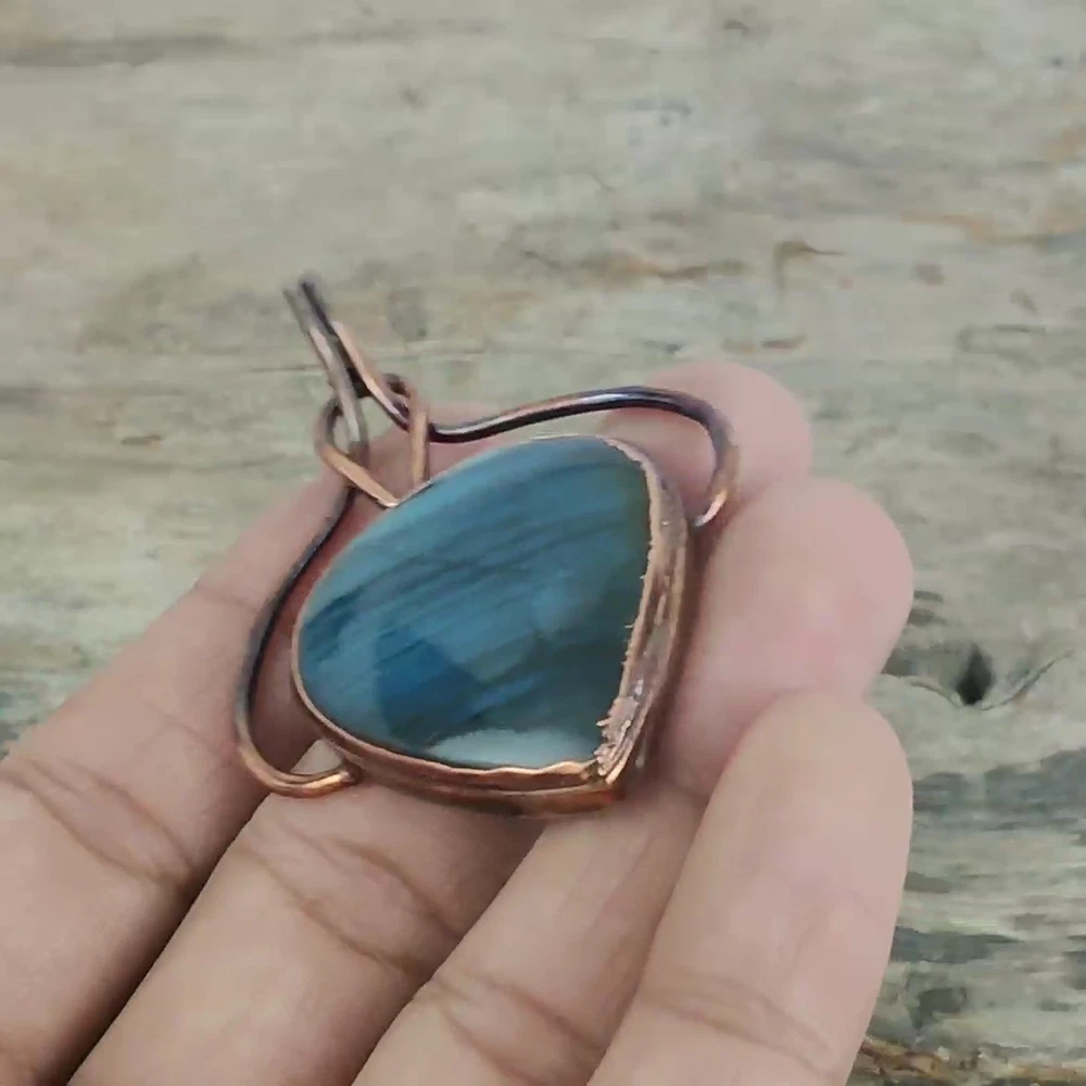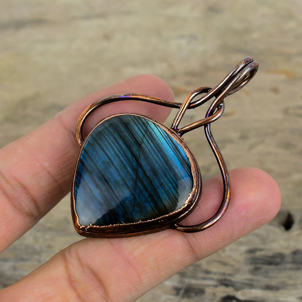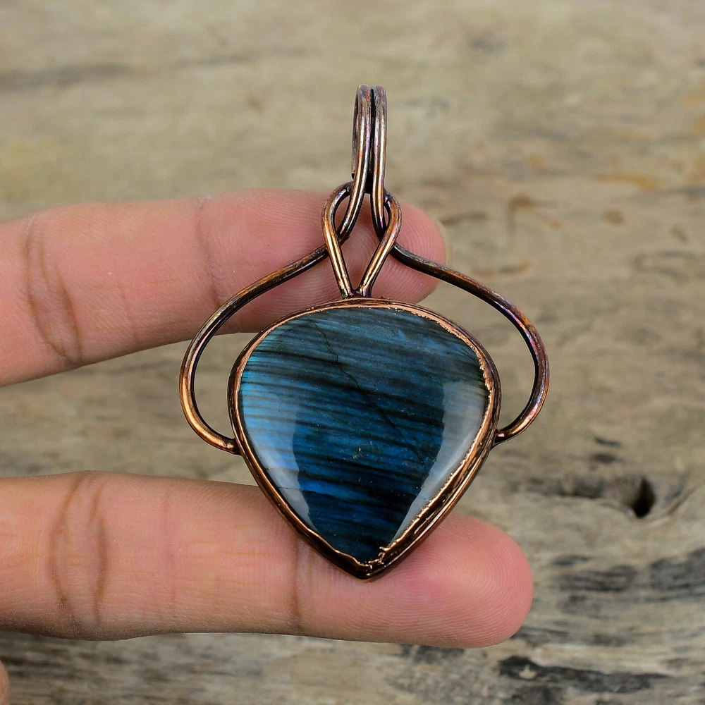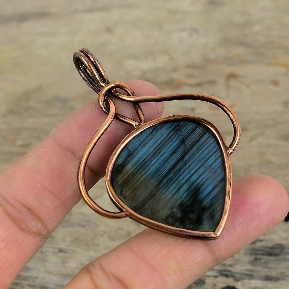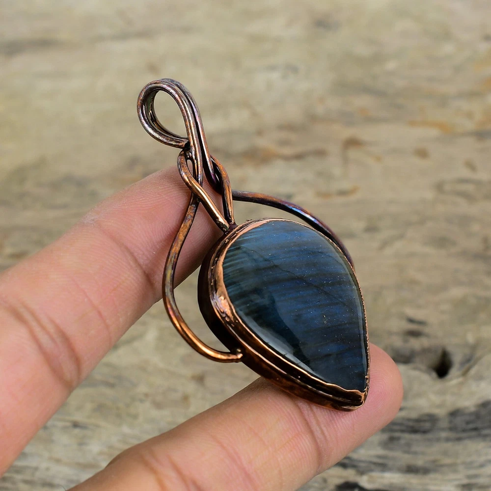 Note : Due to the natural formation of this gemstone. Slight variation in design and color are to be expected. Welcome to Silver Creation Handmade Pendant, Wire Wrapped Pendant, Wire Wrapped Jewelry, Copper Pendant, Copper Wire Pendant, Wrapped Jewelry, Wire Wrap Pendant, Wire Wrap Jewelry SKU : VZP-113 Gemstone : Labradorite Stone Shape : Pear Metal Purity : Unknown Copper Length : 67 Millimetres Width : 50 Millimetres Copper has been used for jewelry making for thousands of years, dating back to ancient civilizations such as the Egyptians, Romans, and Aztecs. Copper was valued for its beauty, versatility, and durability, and was often used to make everything from jewelry and coins to cookware and tools. In addition to its historical significance, copper jewelry also offers several benefits. Copper is a natural conductor of heat and electricity, which makes it ideal for energy healing and therapeutic purposes. Wearing copper jewelry is believed to have various health benefits, such as improving circulation, reducing inflammation, and boosting the immune system. Some people also believe that copper jewelry has the ability to balance energy and improve mood. For Mother's Day Gift For Father's Day Gift For Promise For Valentine' Day For Halloween Party For Christmas Day Gift For New Year Party For Mom For Her If you can't find the information you need or need some advice for your design? Feel free to contact us. We are fast to reply :) All our work is made by hand with Love and Care in our workshop Thank you so much for visiting and hope you enjoy shopping with us Silvercreations is committed to delivering the best quality sterling silver jewelry to customers. As a handmade jewelry manufacturer, we offer an extensive selection of copper gemstone jewelry that showcases the brilliance of our craftsmanship. We are an experienced handmade jewelry supplier with expertise in embellishing gemstones to suit every style. We offer you the liberty to create your jewelry ensemble with sparkling, earthy, and pure gemstones. Our Talented artisans masterfully handcraft each piece of jewelry you see here. Our pieces are made with genuine gemstones.