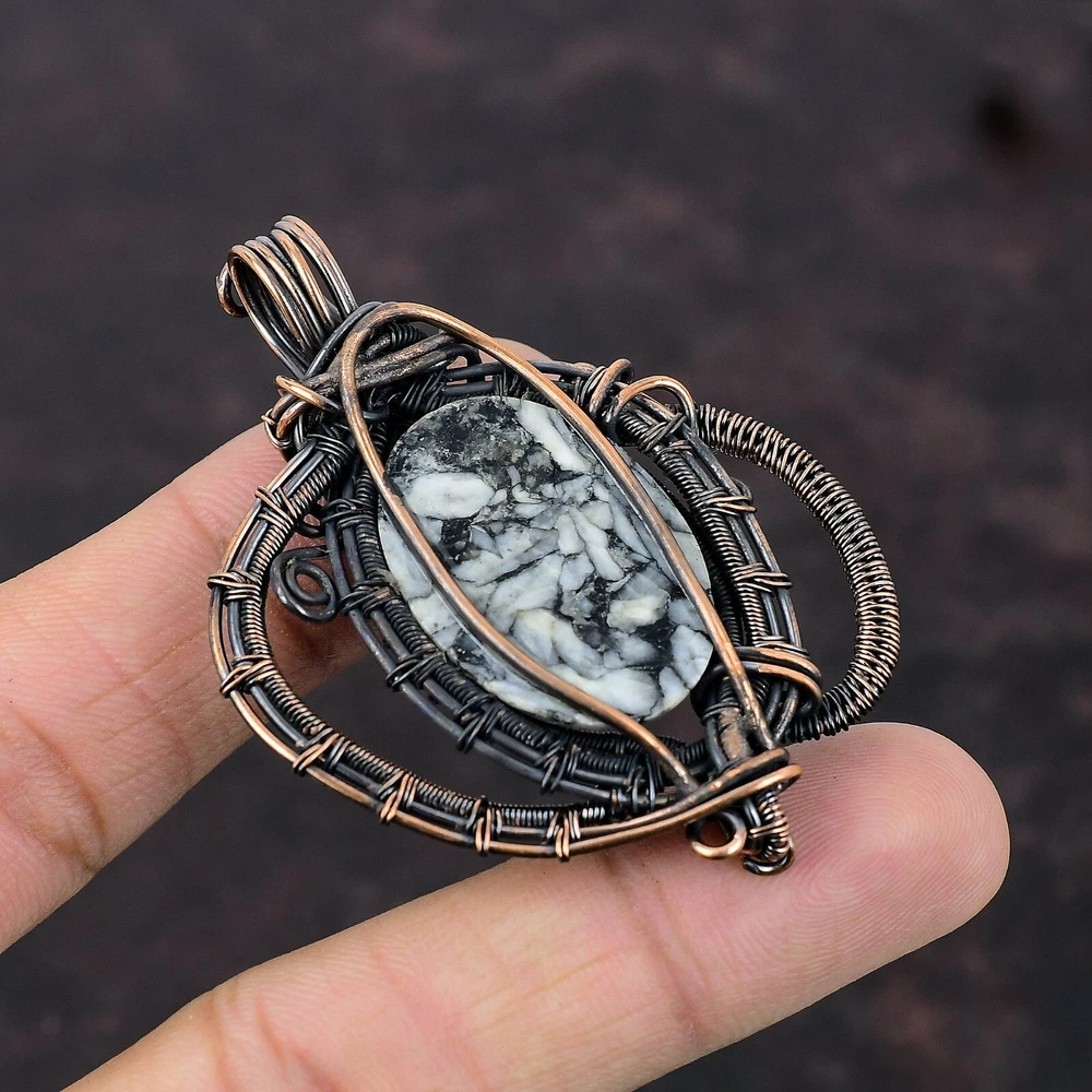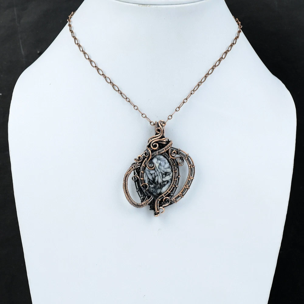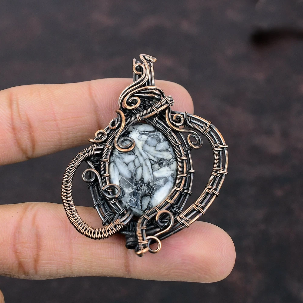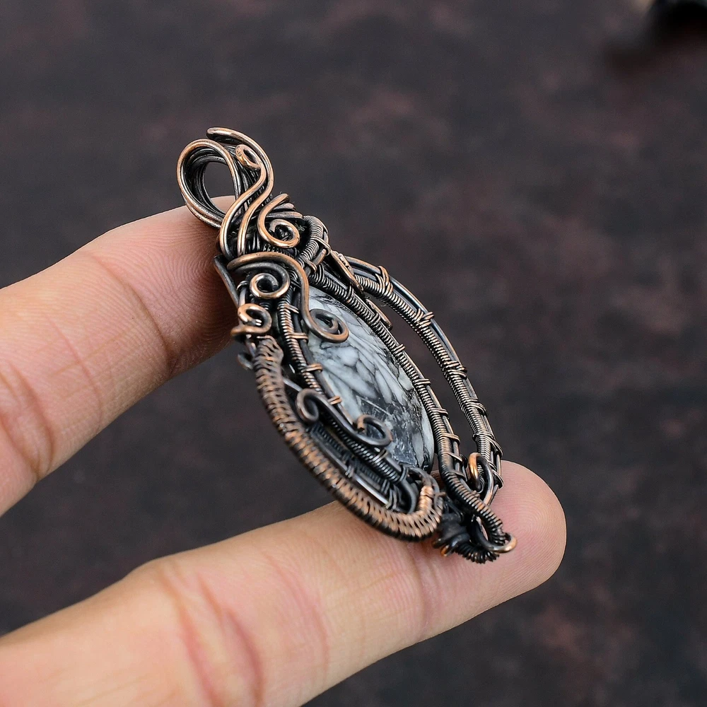 Note : Due to the natural formation of this gemstone. Slight variation in design and color are to be expected. Welcome to Silver Creation Handmade Pendant, Wire Wrapped Pendant, Wire Wrapped Jewelry, Copper Pendant, Copper Wire Pendant, Wrapped Jewelry, Wire Wrap Pendant, Wire Wrap Jewelry SKU : VFWP-1217 Gemstone : Pinolith Jasper Stone Shape : Oval Metal Purity : Unknown Copper Length : 64 Millimetres Width : 48 Millimetres Copper has been used for jewelry making for thousands of years, dating back to ancient civilizations such as the Egyptians, Romans, and Aztecs. Copper was valued for its beauty, versatility, and durability, and was often used to make everything from jewelry and coins to cookware and tools. In addition to its historical significance, copper jewelry also offers several benefits. Copper is a natural conductor of heat and electricity, which makes it ideal for energy healing and therapeutic purposes. Wearing copper jewelry is believed to have various health benefits, such as improving circulation, reducing inflammation, and boosting the immune system. Some people also believe that copper jewelry has the ability to balance energy and improve mood. For Mother's Day Gift For Father's Day Gift For Promise For Valentine' Day For Halloween Party For Christmas Day Gift For New Year Party For Mom For Her If you can't find the information you need or need some advice for your design? Feel free to contact us. We are fast to reply :) All our work is made by hand with Love and Care in our workshop Thank you so much for visiting and hope you enjoy shopping with us Silvercreations is committed to delivering the best quality sterling silver jewelry to customers. As a handmade jewelry manufacturer, we offer an extensive selection of copper gemstone jewelry that showcases the brilliance of our craftsmanship. We are an experienced handmade jewelry supplier with expertise in embellishing gemstones to suit every style. We offer you the liberty to create your jewelry ensemble with sparkling, earthy, and pure gemstones. Our Talented artisans masterfully handcraft each piece of jewelry you see here. Our pieces are made with genuine gemstones.