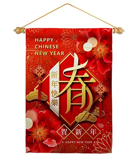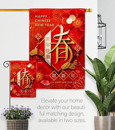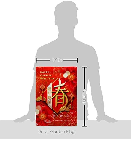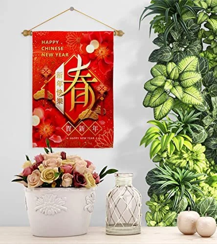 New Year Spring Garden Flag Set Wood Dowel Lunar Good Luck Prosperous Seasona...
