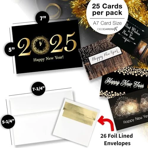 Return Policy Fast Delivery Trusted seller New Years Cards for Business & Family (Variety Pack - Gold) Bulk Greeting Card Set Pack of 25 Happy New Year Cards with Envelopes for 2025 (5x7 inch) Great for Office, Work Employees & Clients VP1505 Product Description NEW YEAR’S VARIETY CARD SET: This professionally designed card set contains twenty-five (25) new year holiday greeting cards. Contains an assortment of 5 unique seasonal card designs (5 cards per design). This set also includes twenty-six (26) premium white envelopes with gold foil lining, which are perfect for both business and personal contacts! CARD SIZE: These happy new year holiday seasonal cards are 15pt gloss coated stock with an aqueous coating to give the greeting cards a nice shine. Festive seasonal greeting cards are 5" x 7" and are printed in full color. PRE-PRINTED MESSAGES: Each New Year’s greeting card has a special pre-printed verse inside, which can be viewed by ing on the product images on this listing. Ideal for coworkers, clients, employees, family, friends, teacher gifts and more! NO SMUDGING: The inside of each holiday card is uncoated to reduce pen smearing & smudging, allowing you to add your own personal message of thanks and appreciation. MADE IN USA: Our bulk new year celebration seasonal greeting card sets include all original designs and do not include glitter, embossing or foil stamping. All of our greeting cards are made in North Carolina, USA! Shipping Returns Payment Shipping Shipping is FREE to all addresses other than APO/PO boxes in the lower 48 states. All our stock ships from US-based warehouses. Shipped via USPS or UPS (depending on location and package weight) Unless stated otherwise, all orders will ship within 24-72 hours of your payment being processed. Check our feedback to see the great reviews of FAST shipping we offer. Returns Seller does not accept returns Payment We currently accept payment via eBay managed payments only. Once payment is cleared, we will dispatch your shipment within 1-3 business days. Please refer to the "Shipping" tab for more information regarding shipping speed to your destination.