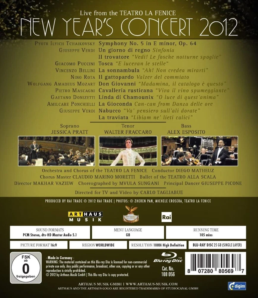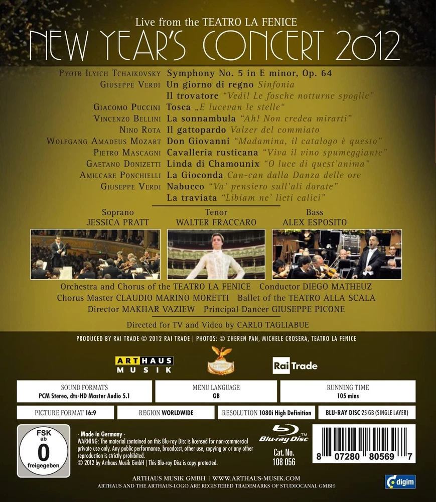 Further Details Title: New Years Concert 2012 (Arthaus: 108056) Condition: New Description: As is now customary, the first part of the 2012 New Years Concert from Teatro La Fenice is exclusively orchestral, with Symphony No.5 by Pyotr Tchaikovsky. The second part, with soloists Jessica Pratt, Walter Fraccaro and Alex Esposito as well as the choir, is dedicated to melodrama, ending with the traditional chorus Va pensiero from Nabucco and the toast Libiam ne lieti calici from La Traviata by Giuseppe Verdi. The twenty-seven year old conductor and violinist Diego Matheuz is a graduate of the internationally known Venezuelan Sistema and is already widely known as one of the most promising developing talents from the Americas. In 2005 he began studying conducting and soon attracted the attention of Sir Simon Rattle and Claudio Abbado, with whom he worked in Caracas, Lucerne and Bologna. In September 2011 he was appointed as Principal Conductor of the Teatro La Fenice. Actor: Jessica Pratt, Walter Fraccaro, Alex Esposito, Orchestra and Chorus of the Gran Teatro La Fenice Country/Region of Manufacture: Regno Unito Format: Blu-ray Language: English EAN: 0807280805697 Director: Diego Matheuz No Of Discs: 1 Run Time: 1 hour and 48 minutes Studio: Arthaus Region Code: Blu-ray: B (Europe, AU, NZ, Africa...) Release Date: 01/18/2018 Release Year: 2018 Missing Information? Please contact us if any details are missing and where possible we will add the information to our listing.