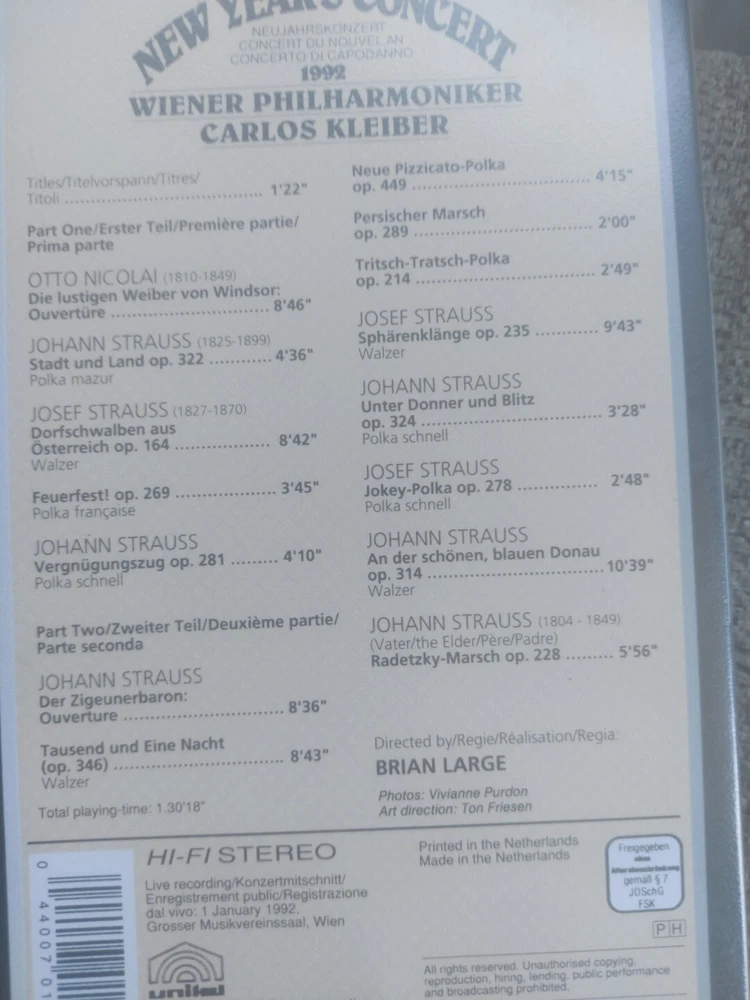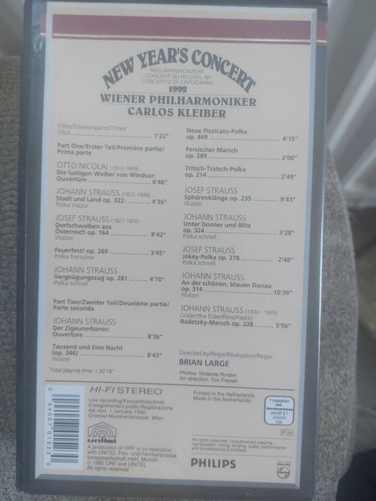 This VHS tape features a stunning New Year's Concert by the Wiener Philharmoniker, conducted by Carlos Kleiber. The tape is a must-have for music and concert lovers, and is certified U for all audiences. The tape is perfect for collectors and fans of classical music. It belongs to the Films & TV category and is listed under VHS Tapes. Don't miss out on the opportunity to own this beautiful piece of music history.