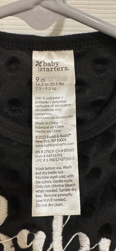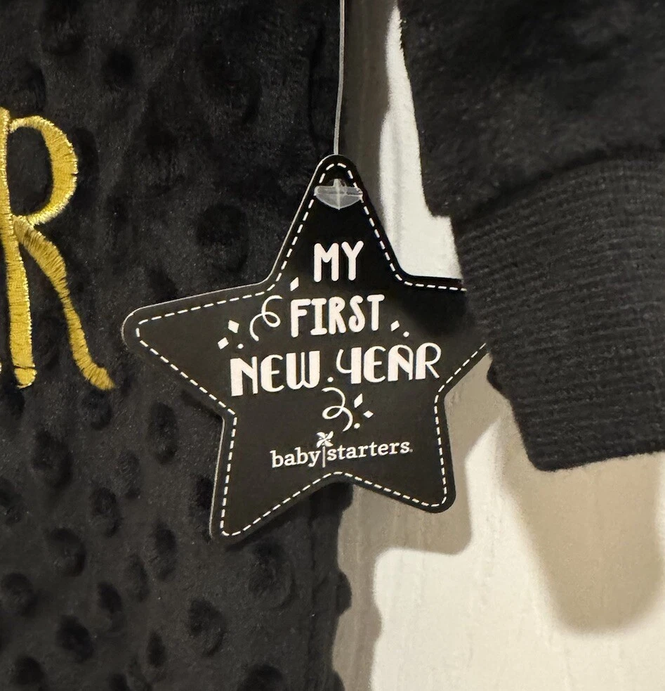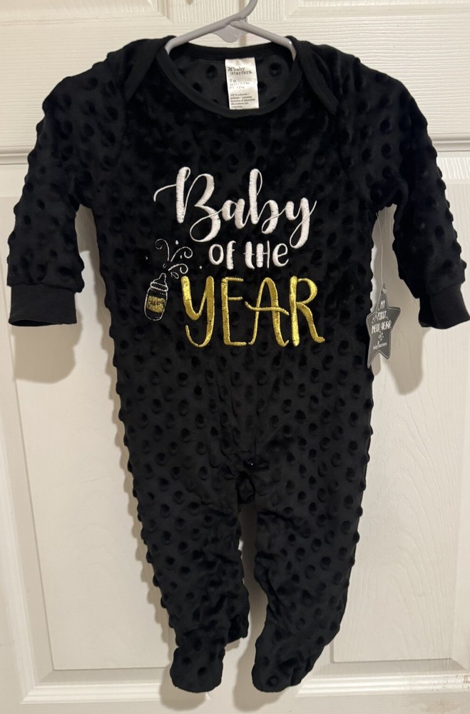 •New •Baby Starters By Rhasti & Rhasti •9 months •Unisex •One- Piece Footed Outfit •Black With Baby Of The In White Font, Year In Gold Font & A Baby Bottle •Snap Closures •100% Polyester Exclusive Of Decorations •Machine Wash Cold, Tumble Dry Low •Wreath Hanger Not Included •Stored In A Smoke Free, Clean Home