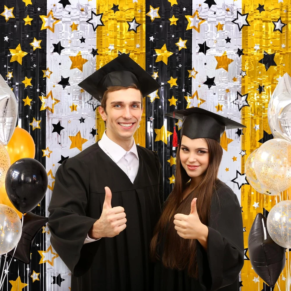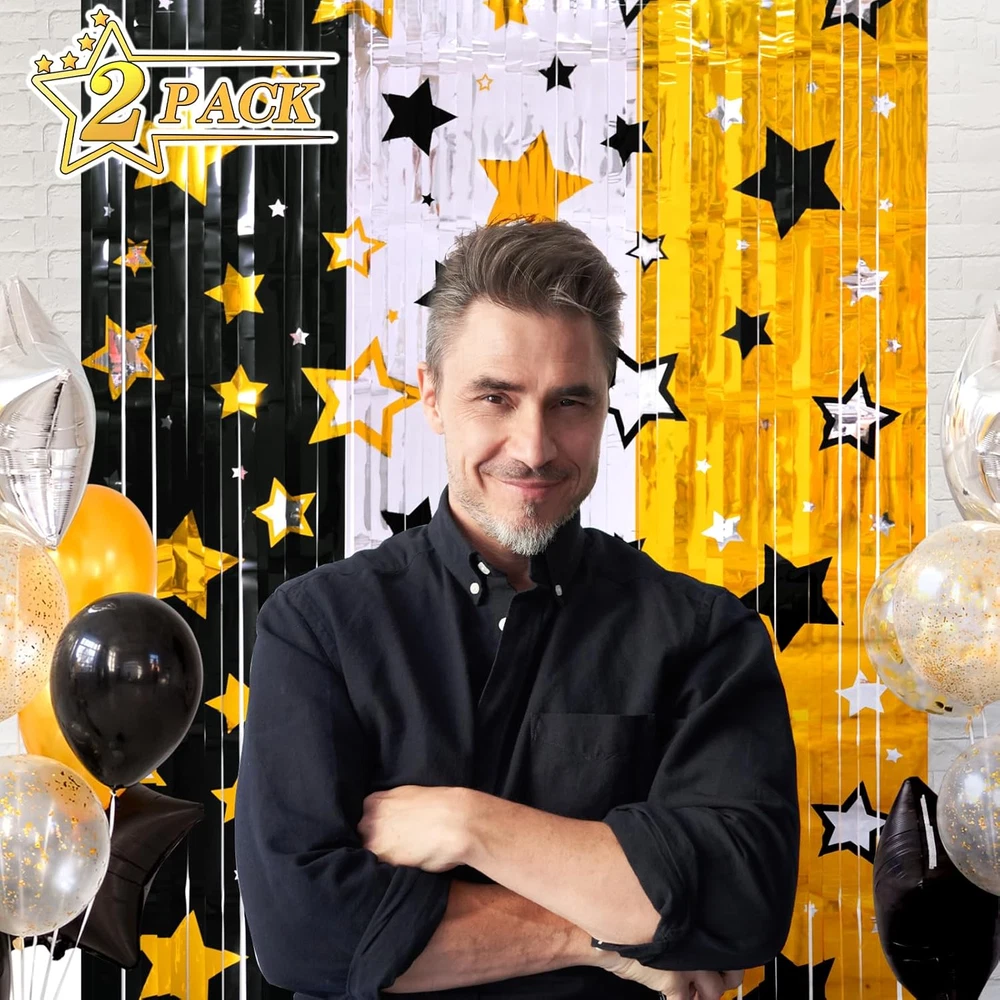 π»γ IT'S TIME TO CELEBRATE! γ: Our 2 pack Black Silver and Gold Stars foil fringe curtains, Large size (width x drop) 3.3 x 6.6 ft each, perfect photo backdrop for various parties. π€γ LET'S MAKE YOUR PARTY SPARKLE! γ: The star pattern foil curtain backdrop is bright and vivid. It creates an awesome atmosphere that will impress everyone at your party. π€γ CREATE an IMPRESSIVE PARTY γ: This beautiful stars foil backdrop are wonderful finishing touch for new years decorations 2025 or any theme party such as birthday party,graduation party,congratulations party,retirement party,anniversary. You can use it for any celebratory moment, and any place you like. βγ SHINY PARTY BACKDROP γ: Our foil fringe curtain is made of tinsel with shiny surface, lightweight and durable metallic fringe curtains. High quality fringe curtains, high toughness, unbreakable, can durable & reusable.Perfect for a new years eve party live streamer backdrop, broadcast streamer backdrop, dessert table backdrop, happy birthday backdrop, happy new year stage backdrop, disco backdrop, retirement backdrop, bar backdrop, office backdrop decoration, home decoration, etc. π·γ EASY TO DECORATE γ: Just Tear off the back of double-sided adhesive tape, then paste the fringe curtain on the top of the decorative place. Product Description Star Party Foil Fringe Curtains LET'S CELEBRATE!! Shiny Party!! Shiny and beautiful Black Silver and Gold Stars tinsel foil fringe curtains, create the perfect background for parties like birthday parties,retirement party,graduation party,or anniversary party photo backdrops at the least cost. More than imagination These beautiful black and gold stars pattern foil fringe curtains can also be used as daily shooting backgrounds or live streamer backgrounds, and they are also a good choice for home decoration! Let this joy be suitable for all ages! The video showcases the product in use. The video guides you through product setup. The video compares multiple products. The video shows the product being unpacked. COLOURFUL PARTY DECORATIONS