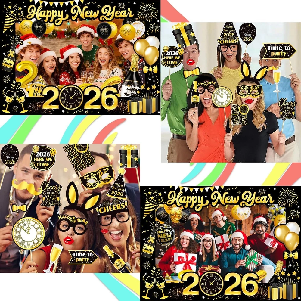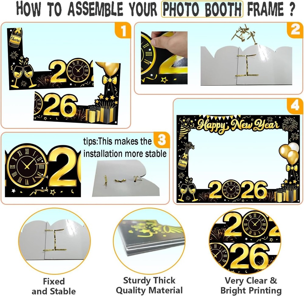 About this item: New Year Eve Party Supplies 2026 : New year 2026 photo booth props set Includes 1set Giant Happy New Year Selfie Frame, 18pcs New Year Photo Booth Props, NYE Photo Booth Props 2026 full of New Year's Eve elements are enough for you to celebrate with your family and friends on New Year's Eve party! Happy New Year Photo Props 2026: 18pcs new year photo props accessories for your face or head, including 2026 glasses, moustache, red lips, hats, 2025 clock, happy new year sign, bow tie etc. Happy New Year 2026 Selfie Frame is very suitable for taking photos in the New Year and capturing beautiful moments. Easy to use:Giant Happy New Year Selfie Frame measure 50x70cm/19.6 x 27.5inch, For more convenient and safe transportation, we have divided it into four parts. You need to use accessories to fix them together, and in a few minutes, you can easily use them High quality material:The New Year photo booth props are made of sturdy thick paper, excellent quality, robust and durable. Widely Application: New years eve decorations are unique and interesting design with some cute pattern.You can make many fun ways to use these cute photo booth props! 2026 New years photo props are perfect for New years party, friends party and family gathering, etc.