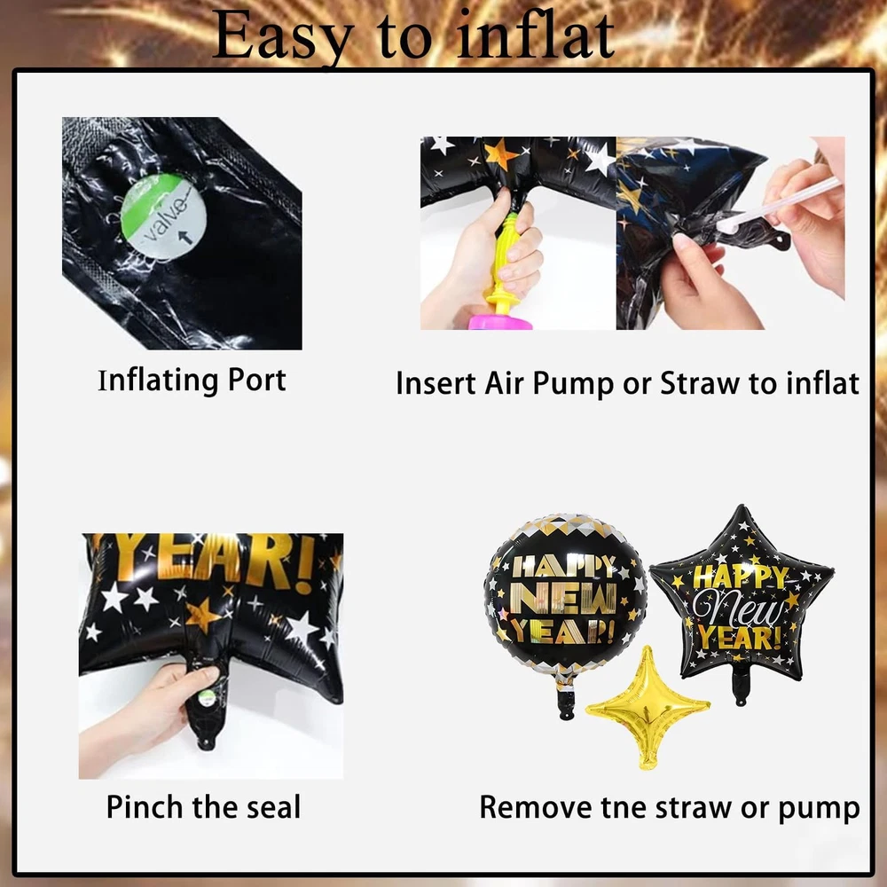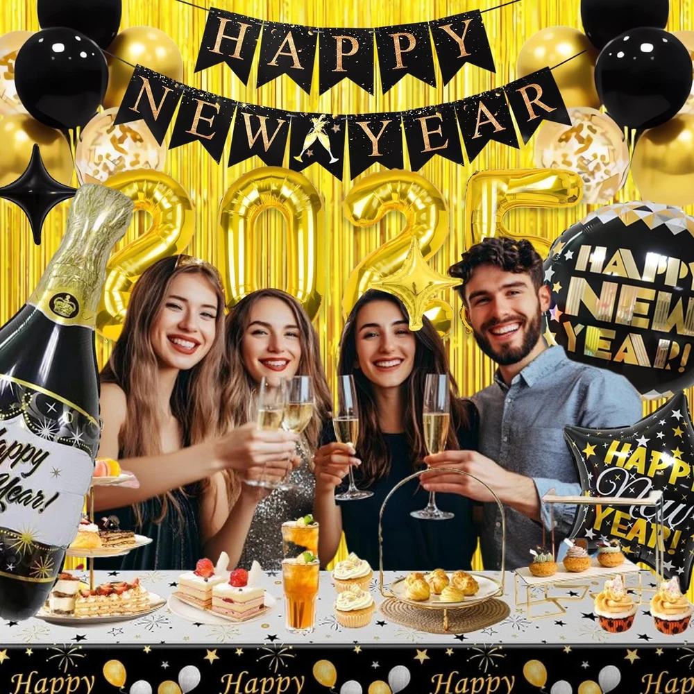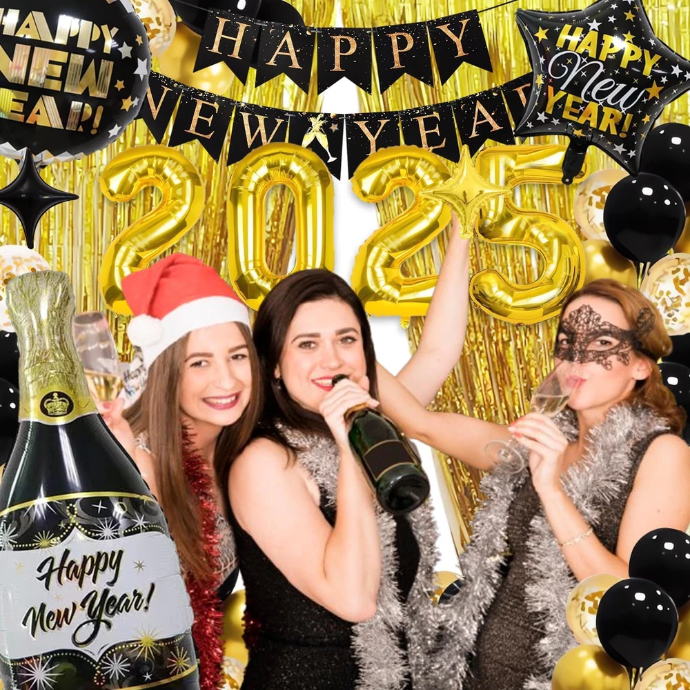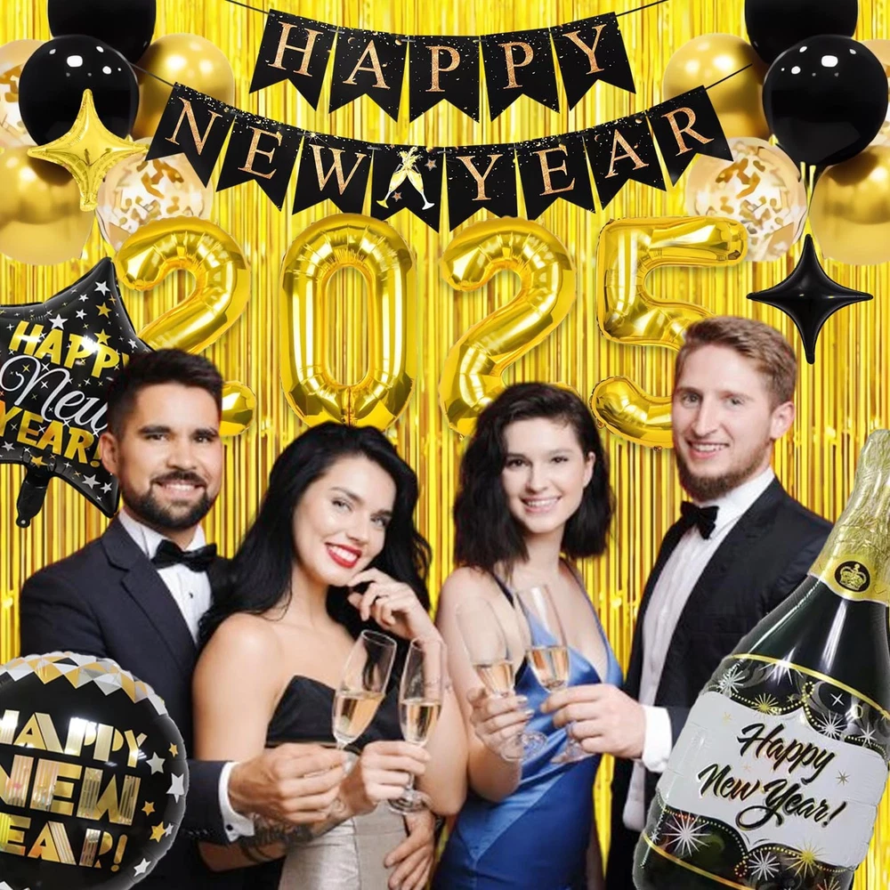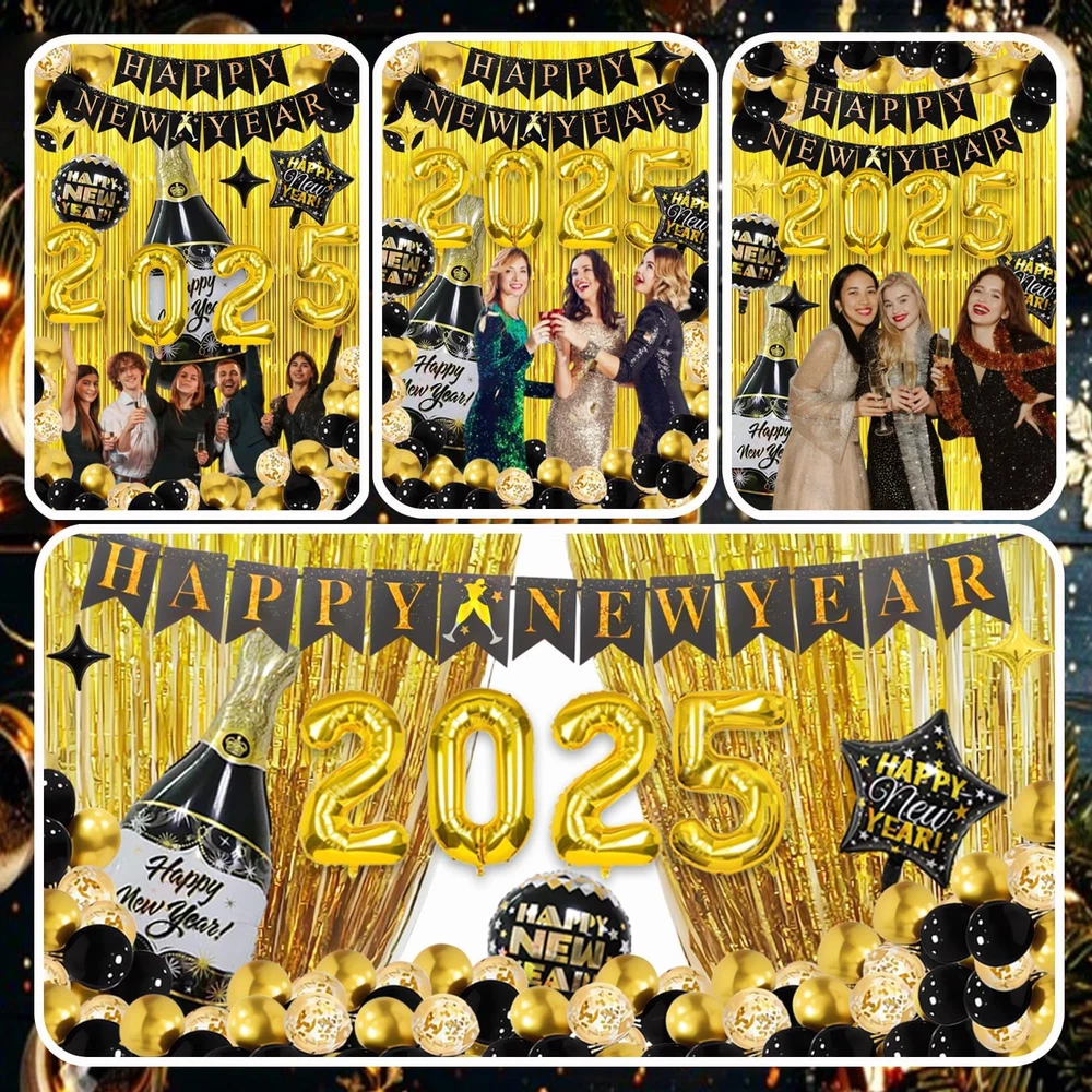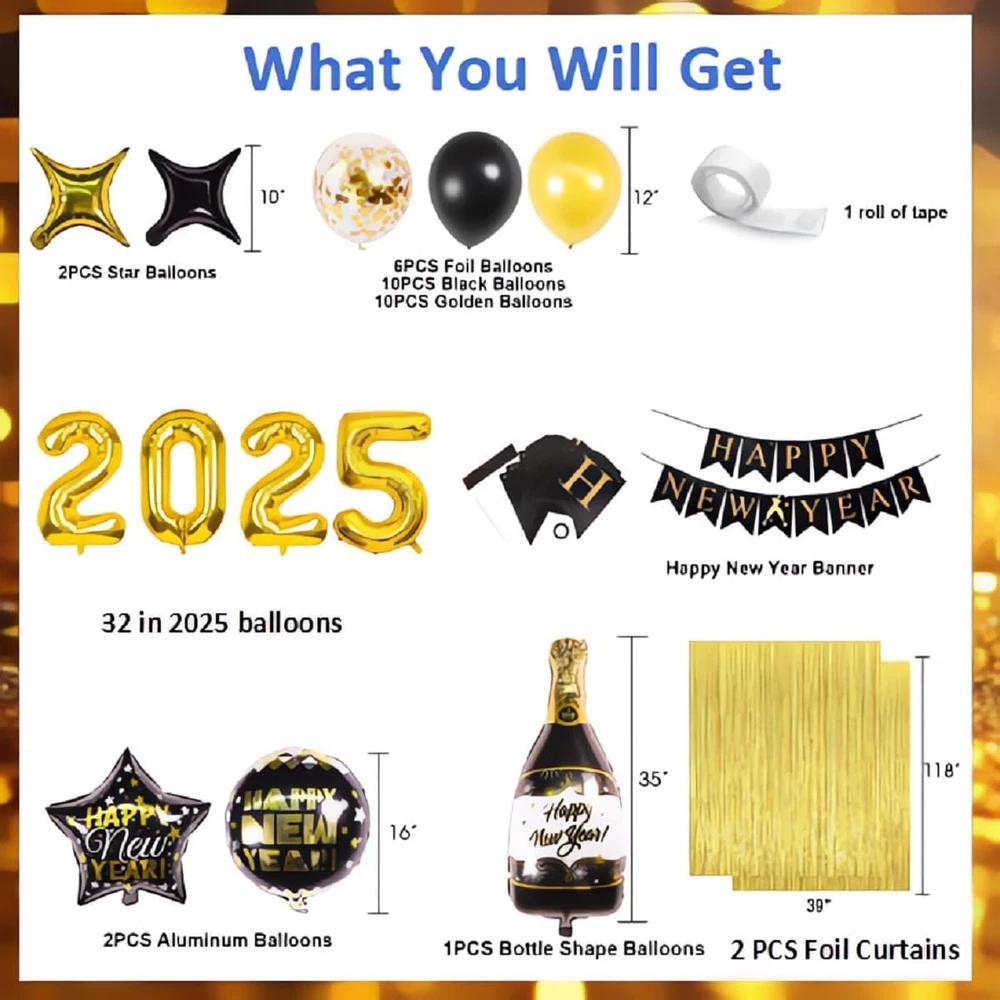 New Years Eve Party Balloons Set: 2025 new years eve accessories- Happy New Years banner 1, 2025 foil balloons set 1, gold fringe curtains 2, latex balloons 26(10 gold, 10 black, 6 golden confetti), four star balloon 2, 1 bottle foil balloon, foil balloon 2(round and five star), 1 dot glue and 2 straws to inflate Full with 2025 New Year's Atmosphere: We know the importance of spending quality time with your family at your New Year's event. 2025 New Year's kit will ensure you get the perfect and memorable photos you want. Spend more fun time with family and friends on a great New Year's Eve Easy to Use: Make your 2025 New Year's Eve party unforgettable. New Years Black and Gold Party Balloons Garland Arch Kit included tools such as straws, dots of glue, easy to use so that you can easily DIY everything you need for your party. Celebrate the 2025 New Year's Eve party with our New Year's Eve party favors for everyone Not easy to Explode, Leak and Reused: These New Year Balloons Arch Garland Kit are reusable, durable. Happy New Year are printed on sturdy cardboard banners, elegant fringe curtain backgrounds, natural latex balloons, thick foil balloons. Each balloon will keep its shape for a long time, bringing you a happy New Years party Suitable for all Party: If you are looking for New Years party supplies for your family or friends, this New Year's kit will be a perfect choice. It features the latest design and is large enough for indoor and outdoor use. Our 2025 New Year Decorations Kit can be used for birthday, Christmas party, home, restaurant, hotel, coffee shop Best Gift: Great gift ideas for your life! Happy New Year Decor 2025 Kit are a great gift for boyfriends, brothers, sons, husbands, dads or male friends on Christmas, birthdays, anniversaries, and Father's Day Product Description