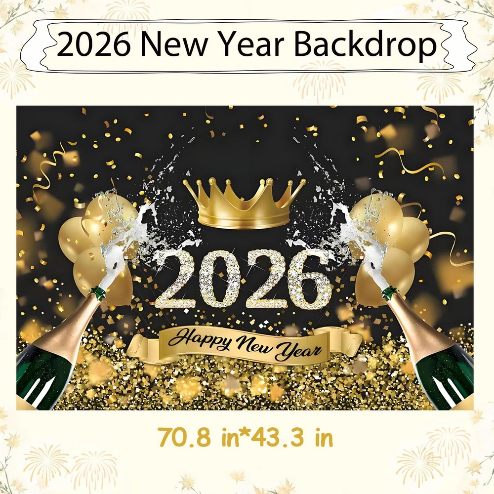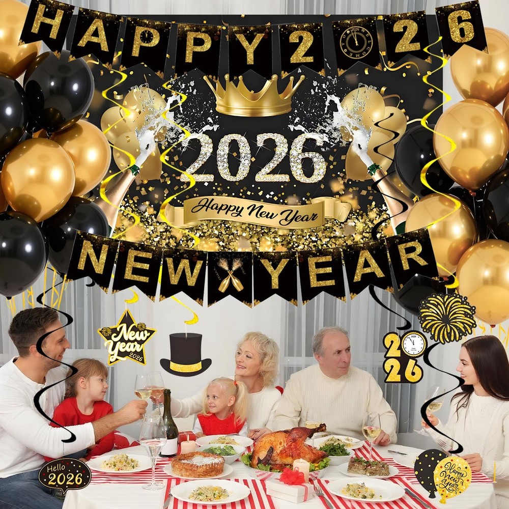 New Years Eve Party Supplies 2026, Happy New Year Banner with Happy New Year Backdrop 2026, Balloons, Hanging Swirls for 2026 Years Decorations 2026 New Years Decorations: Our happy new year 2026 include 180cm*110cm 2026 new years backdrop, 2026 happy new year banner, 6pcs 2026 new year cards with 6pcs hanging swirls, 10pcs 12'' black latex balloons, 10pcs 12'' gold metallic latex balloons, ribbon, glue dot New Years Eve Decorations 2026: The 2026 Happy New Year decorations is composed of dazzling gold and steady black, highlighting a noble and elegant atmosphere. It is the perfect choice for New Year parties and is perfect for adding elegance and nobility to this special New Year decoration moment, creating a special and unforgettable moment for your loved ones and family Happy New Year 2026: Do you want to give your loved one a beautiful and unforgettable New Year? Do you want to add some beautiful colors to your loved ones' and family's holiday parties? Our 2026 New Years decorations can perfectly help you achieve it! Through a series of colorful and unappealing decorations, you can easily create a magical atmosphere, allowing your family and friends to spend a beautiful and unforgettable day 2026 New Years Backdrop: Our New Year decorations 2026 is popular among children, girls, women, and men of all ages, suitable for family gatherings, company annual meetings, school classroom themed parties, and more. It can be hung on wall, ceiling, table background, doorway. This is the perfect decoration for our New Year's party. Now, let's enjoy our party happily High Quality: Our New Years eve party supplies are made of the best materials, safe, non-toxic, and durable.However, it is worth noting that balloons should try to avoid overheating, sharp objects, and excessive friction, otherwise they are prone to bursting