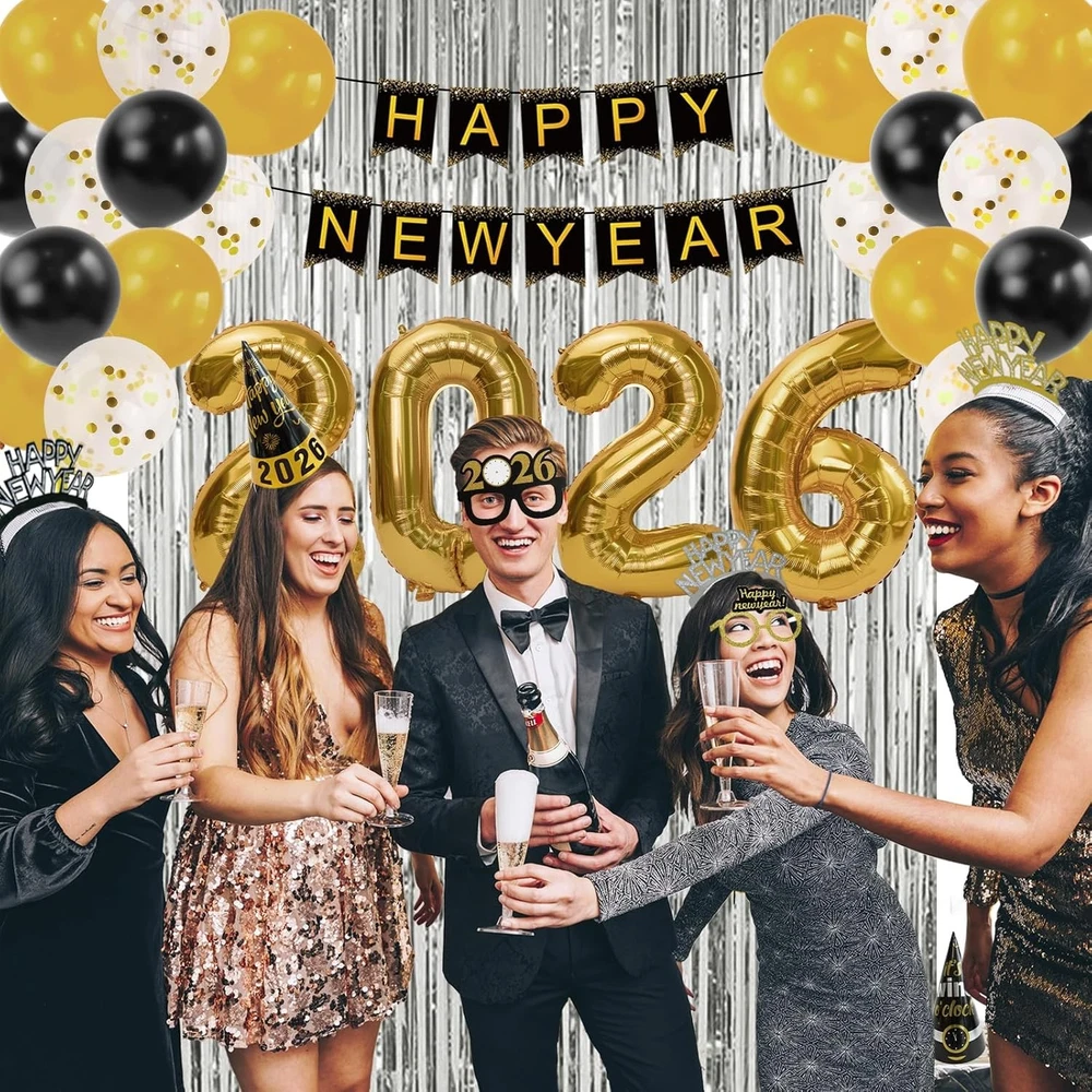 New Years Eve Party Supplies 2026 - Happy New Year Decorations Kit - Set of 50 Includes Banner, Hats, Ribbon, Glasses,Tiaras, Balloons, Squawkers and Fringe Curtains - Accessories for Kids Party Decor Color Gold Material Foil Included Components Banner Unit Count 1.0 Count Brand ORIENTAL CHERRY About this item Get ready for new year's eve party with these items that will serve your party of 12. Includes 50 pieces: happy new year banners, 2026 number balloons, 1 black ribbon for balloons, 5 white balloons with gold confetti, 10 foil balloons (5 black, 5 gold), 6 hats, 6 glasses, 6 tiaras, 12 squawkers and 2 fringe curtains. 32inch large gold “2026” balloons will be impressive for all the guests. The hats arrive unassembled, but we promise it will be easy! Perfect for new year party you want plan at home or in the office!