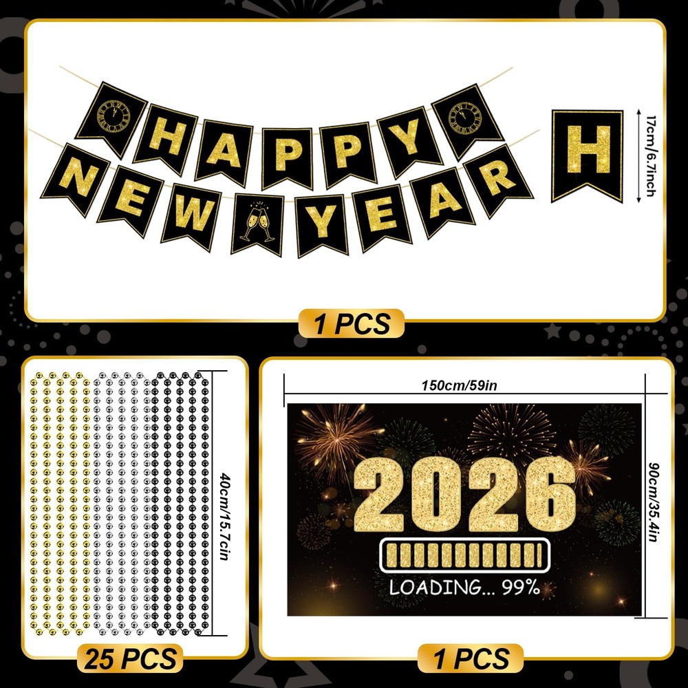 New Years Eve Party Supplies 2026 - Happy New Year Party Supplies Kit for 50 Guests, Including Hats, Glasses, Les, Beads, Squakers, a backdrop and a banner NEW YEARS PARTY SUPPLIES 2026 - This pack in cludes 25 Hats, 25 Glasses, 25 Les, 25 Beads, 25 Squakers, 25 Blowouts, a Happy New Year Backdrop, a New Years Eve Party Banner and a New Years Eve Backdrop HIGH QUALTIY NEW YEAR BACKDROP - The new year backdrop in this pack is made of high quality fabric, which is thick, durable and well printed REAL FOIL - As you see from the picture, the banner is shinny and bright. It's not printed by ink. It's real foil GREAT BOX - All the stuffs are packed in a great box. What's more Different parts are individually packaged in different bags. You don't need to worry about there is a mass in the box 100% GUARANTEED AND CUSTOMER SERVICE - We're absolutely sure you'll love our product. If, for some reason, you are not satisfied with the kit, we provide 45-day money-back. Your satisfaction means the world to us. So feel free to contact us if you have any question