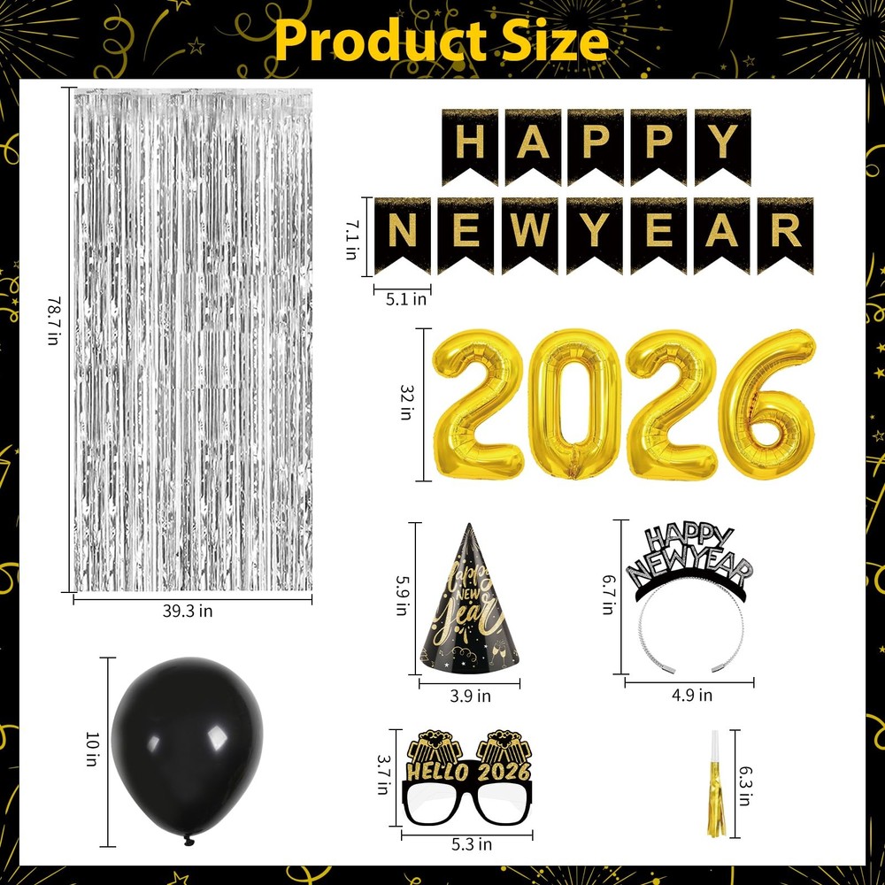 New Years Eve Party Supplies 2026 New Years Decorations Kit: The New Years Eve decorations kit includes Happy New Years Banner* 1, Foil fringe curtains* 2, 2026 Foil Ballons* 1, 10 inch Balloons* 15, New Years Glasses* 6, Happy New Year Tiaras* 6, Cone Hats* 6, Squawkers* 12. More than enough to cover your 2026 New Year's Eve party decoration needs—delivering an unforgettable party experience. Happy New Year Decoration 2026: Our New Year's Eve party supplies boast a black, gold, and silver theme, crafting a cheerful vibe for parties and gatherings. With a simply elegant, shiny, and beautiful style, this set’s props are perfect for catching guests' eyes during New Year’s holiday celebrations, and they also help capture all memorable moments while lighting up your 2026 New Year’s Eve night. Premium Materials: Our NYE decorations are made of premium materials. The foil curtains and 2026 number balloons feature glittering elements to elevate the charming party atmosphere—ideal for welcoming the new year. Sturdy cardboard materials also allows reuse for future celebrations. Easy to Assemble: Our New Years Eve party decorations are simple to put together. The banners come pre-assembled for easy installation, and the hats are easy to assemble—so you can spend less time setting up and more time enjoying the party with family and friends to celebrate the new year’s arrival. Versatile Occasions: They’re excellent decorations for party backgrounds and festive occasions. They’re also ideal for homes, offices, and event spaces—suitable for New Year’s Eve parties, holiday gatherings, family get-togethers, Christmas parties, and even as photobooth props, etc. These New Years accessories elevate New Year’s Eve party vibes and festive atmosphere, creating a vibrant, fun-filled space for New Year’s Eve countdowns and celebrations.