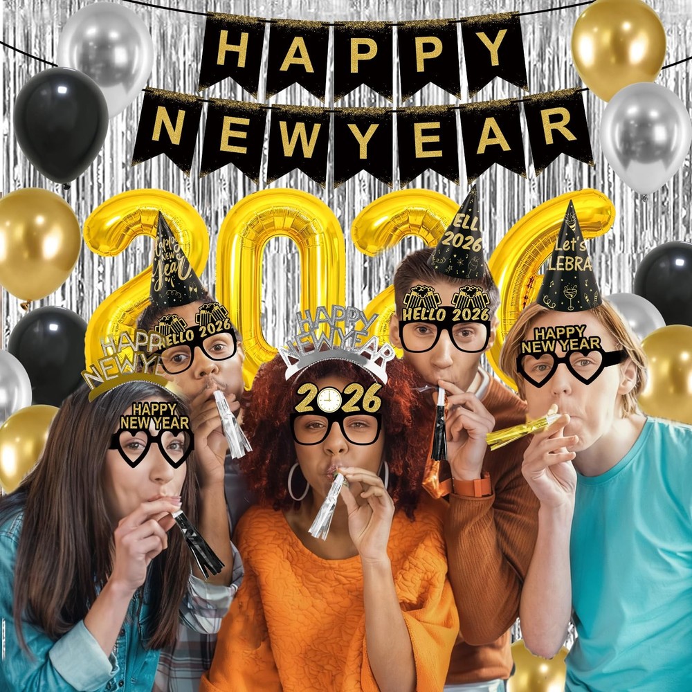 New Years Eve Party Supplies 2026 New Years Decorations Kit: The New Years Eve decorations kit includes Happy New Years Banner* 1, Foil fringe curtains* 2, 2026 Foil Ballons* 1, 10 inch Balloons* 15, New Years Glasses* 6, Happy New Year Tiaras* 6, Cone Hats* 6, Squawkers* 12. More than enough to cover your 2026 New Year's Eve party decoration needs—delivering an unforgettable party experience. Happy New Year Decoration 2026: Our New Year's Eve party supplies boast a black, gold, and silver theme, crafting a cheerful vibe for parties and gatherings. With a simply elegant, shiny, and beautiful style, this set’s props are perfect for catching guests' eyes during New Year’s holiday celebrations, and they also help capture all memorable moments while lighting up your 2026 New Year’s Eve night. Premium Materials: Our NYE decorations are made of premium materials. The foil curtains and 2026 number balloons feature glittering elements to elevate the charming party atmosphere—ideal for welcoming the new year. Sturdy cardboard materials also allows reuse for future celebrations. Easy to Assemble: Our New Years Eve party decorations are simple to put together. The banners come pre-assembled for easy installation, and the hats are easy to assemble—so you can spend less time setting up and more time enjoying the party with family and friends to celebrate the new year’s arrival. Versatile Occasions: They’re excellent decorations for party backgrounds and festive occasions. They’re also ideal for homes, offices, and event spaces—suitable for New Year’s Eve parties, holiday gatherings, family get-togethers, Christmas parties, and even as photobooth props, etc. These New Years accessories elevate New Year’s Eve party vibes and festive atmosphere, creating a vibrant, fun-filled space for New Year’s Eve countdowns and celebrations.
