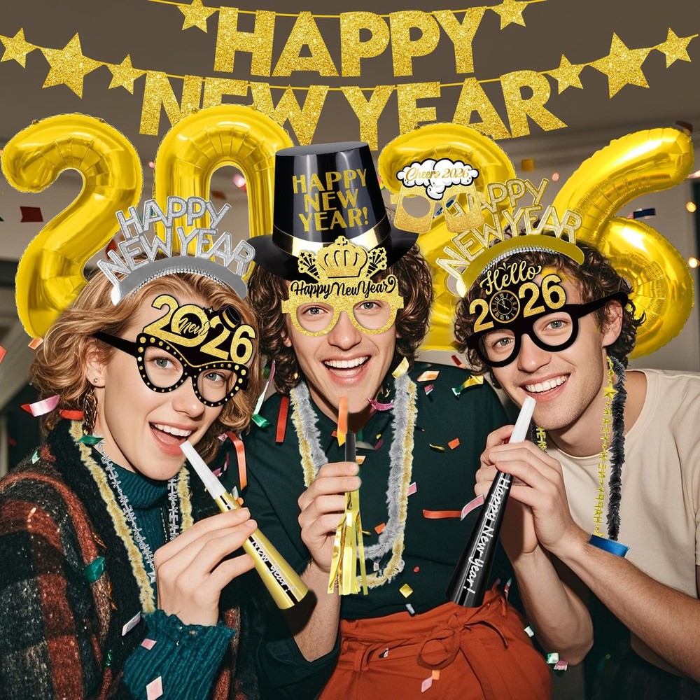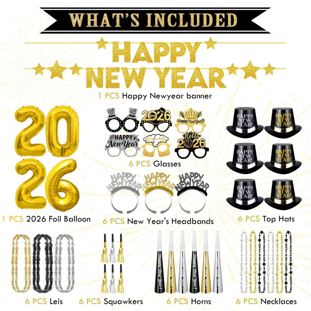 Ring in the New Year with this ultimate party pack! It includes everything you need to celebrate in style. Kick off the festivities with the eye-catching 2026 gold foil balloon numbers and a glittering "Happy New Year" banner. Get the party started with fun accessories like tiaras, hats, glasses, horns, and necklaces in festive black and gold designs. When the clock strikes midnight, toast with the included blowers and noisemakers. This comprehensive kit has enough supplies for 12-20 people, making it perfect for hosting a lively gathering or ringing in the new year with close friends and family. Usher in 2026 with joy and merriment using this all-inclusive celebration set. Package Includes: This 2026 New Years Eve Party Supplies set doubles as both decorations and party costumes, including 32 inch "2026" foil balloons, 1 Happy New Year banner, 6 plastic top hats, 6 New Year's headbands, 6 party horns, 6 squawkers, 6 glasses, 6 leis and 6 necklaces Premiun Quality Materials: Made with durable plastic, foil, and cardboard, these accessories are both stylish and sturdy. Whether you're wearing a lei necklace or making noise with a party horn, all items are designed for comfort, safety, and endless fun. Perfect for 12 Guests: Designed for up to 12 guests, this kit includes enough accessories for everyone to join in the fun. From top hats to party horns, every guest can celebrate together in style with coordinated and festive items. Suitable for All Ages: Our Happy New Year Decorations 2026 Pack is perfect for adults and children! It includes the most adorable party hats, measuring 11 x 4.72 inches, and a festive New Year's headband, measuring 7.48 inches New Year’s Eve Theme: Featuring elegant black, gold, and silver colors with “2025” designs, this set perfectly captures the New Year’s spirit. Whether you're hosting a family gathering or a party with friends, these accessories are ideal for creating unforgettable memories and amazing photo opportunities.