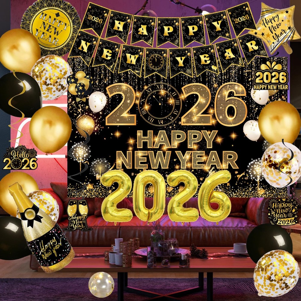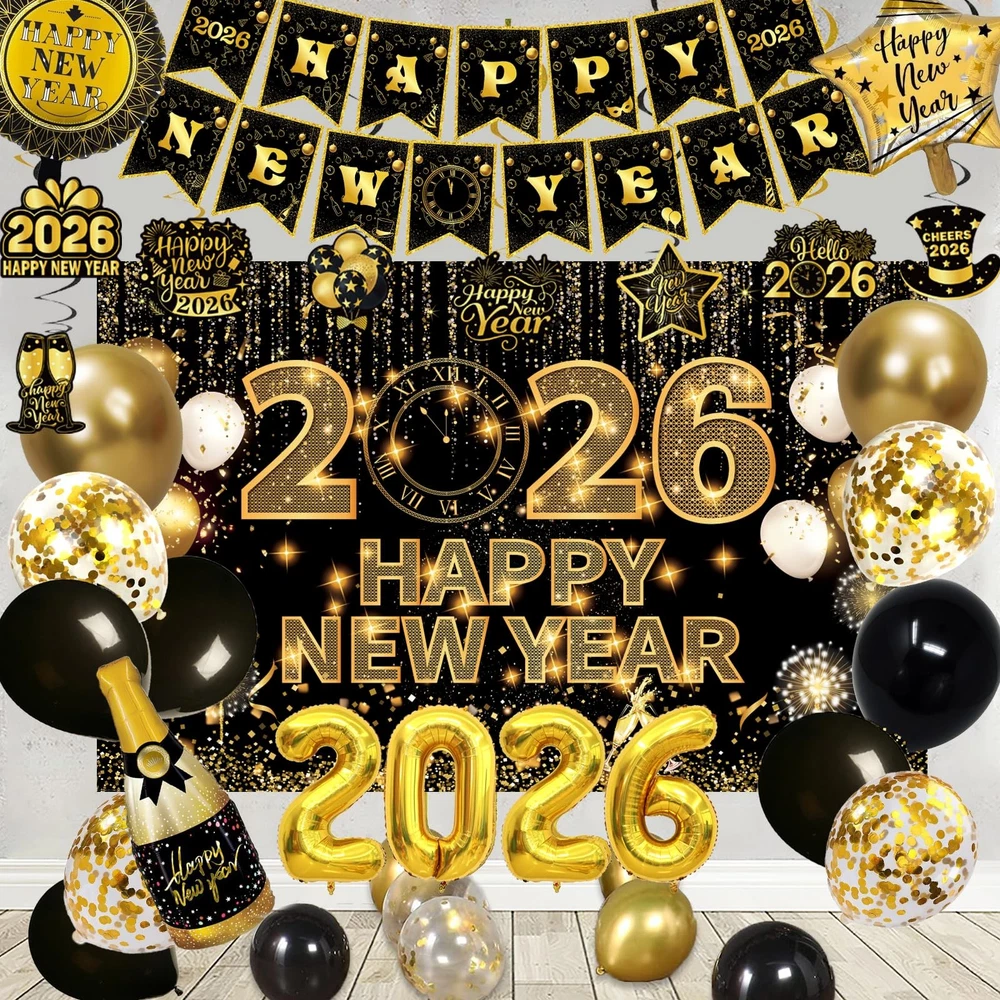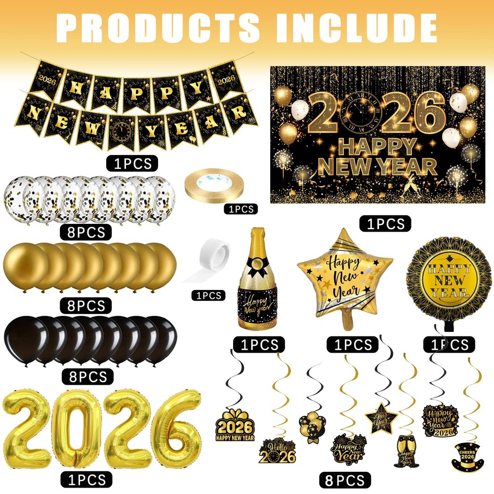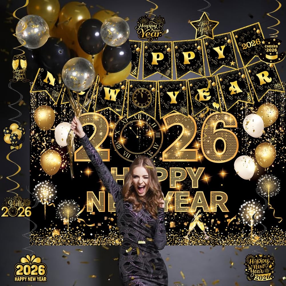 1 【New Years Decorations 2026】:The kit included 1pcs happy new years backdrop 2024(71x43 Inch) ,8 PCS Swirl Streamers,2024 number balloons(16Inch), 1PCS happy new banner,8 pcs black balloons, 8pcs metallic gold balloons, 8pcs gold confetti balloons, 1pcs wine bottle new year foil balloons, 1pcs round happy new years foil balloons(18Inch), 1pcs stars happy new years foil balloons (18Inch) 【New Year Background】: New Year background banner and porch sign are an excellent background for taking pictures of the Happy New Year party. It is suitable for New Year party celebrations and creates an atmosphere for the party. Your 2024 New Year party will be an impressive event, 【Save Time】: There is no complicated installation process for this New Year Eve decoration and you can set it up in just a little time before the party starts so you can have more time to spend with your family and friends.Also, you'll clean up after the party in as little time as possible.Use your creativity to create the perfect party scene! 【Suitable Occasions】: happy new year 2024! our happy new year decorations 2024 are the ideal decoration for a new year's party, decorating walls, your living room, windows, fireplace, front door, over the food table or candy buffet, and so on. a beautiful and attractive black and gold 2024 happy new years banner will shine and glitter with a happy new year balloon 【Satisfactory Customer Service】: Nothing could be more important than your satisfaction for our service! If you are not satisfied with your purchase,you can contact us at any time and we will provide the best service.