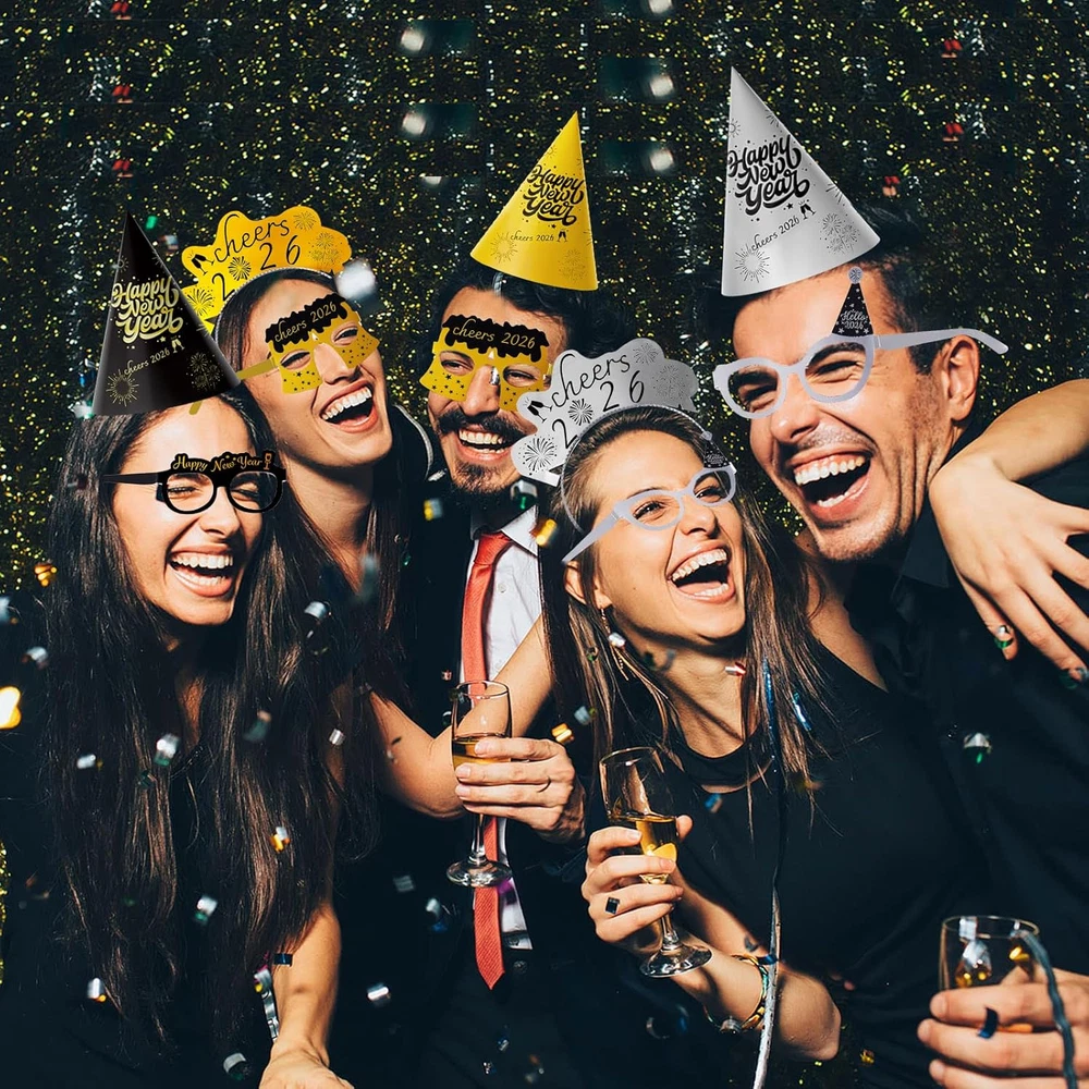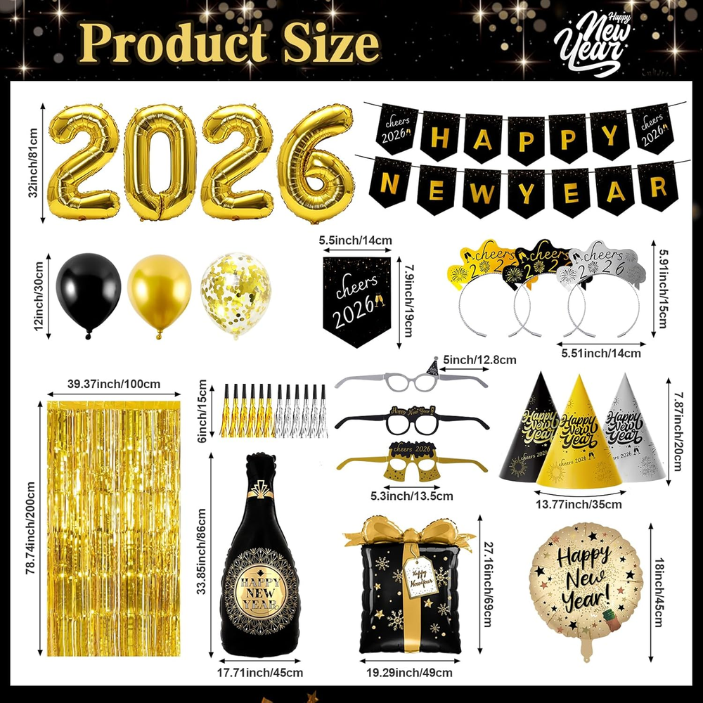 Elevate Your Celebration: Prepare for an unforgettable new years eve bash with our all-inclusive 2026 new years eve party supplies! This complete kit caters to up to 12 guests, featuring 6 hats, 6 glasses, 10 party squawkers Blowers , 6 tiaras, 2 champagne-shaped balloons, 2 star-shaped balloons, 2 fringe curtain, a set of "2026" balloons, a happy new year banner, and 30 assorted balloons. Everything you need for a dazzling celebration is neatly packed in one box. Convenience Redefined: Bid farewell to last-minute shopping hassles. Our new years eve decorations offer a hassle-free experience, ensuring you have all the essentials for hosting a flawless party. From fun accessories to stunning decorations, each item is meticulously chosen to guarantee your party is a resounding success. Easy assembly lets you focus on making memories with loved ones. Versatile and Vibrant: Whether it's an intimate family get-together, an office soirée, or a lively bash with friends, this new years eve party supplies set is versatile for any occasion. The assortment of items ensures a memorable and fun-filled event, regardless of the setting. Hats, glasses, squawkers, and tiaras infuse a playful spirit, making it effortless for everyone to embrace the festive vibe. Chic Black and Gold Touch: Transform your New Year's Eve celebration with our sophisticated black and gold-themed new years decorations . The elegant color palette exudes luxury and refinement, setting the stage for an opulent party. Impress your guests with large gold "2026" balloons, complemented by black and gold balloons and shimmering sequin background, creating the perfect background for capturing special moments. Craft Memories That Last: More than just decorations, our 2026 new years decorations help you create lasting memories with those you cherish. The nye decorations kit is made from premium materials to ensure a polished look that endures through the night. The champagne-shaped and star-shaped balloons, along with the sequin backdrops, add a touch of glamour, perfect for photo opportunities. The happy new year banner and "2026" balloons serve as stunning background accents, guaranteeing a party to be cherished. Celebrate in style and forge unforgettable moments at your 2026 new years bash! Product description 2026 New Years Eve Party Supplies Happy New Years Decorations 2026 Kit