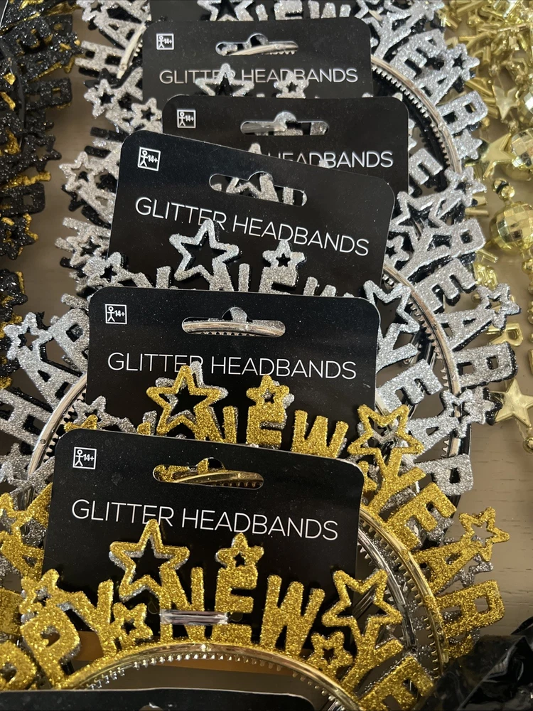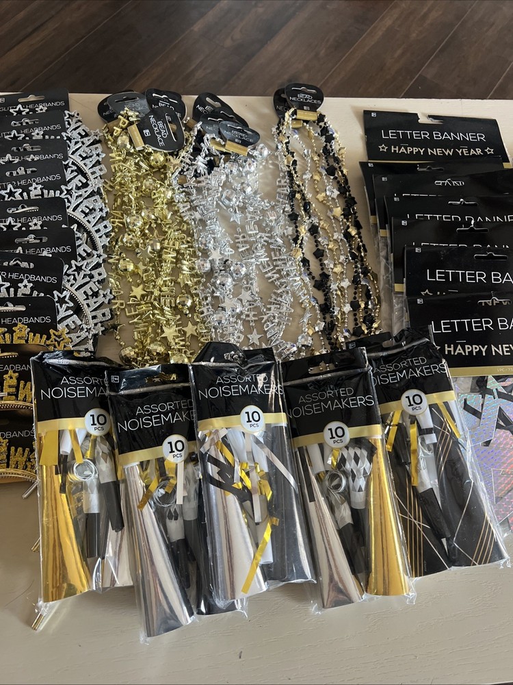Large lot for New years Eve celebration. 22~Black and Gold Glitter headbands. Total. 6~Gold and Silver Glitter headbands. Total. 14~ Silver and Black Glitter headbands. Total. 50 ~Total Noisemakers. 18 ~Total Bead Necklaces. 7~ Happy New Years Banners. 6 packages of air filled balloons. ( 6 per pack. 36 total Balloons) 3~ Light up necklaces Total. New and in packages. 156 total individual pieces included .