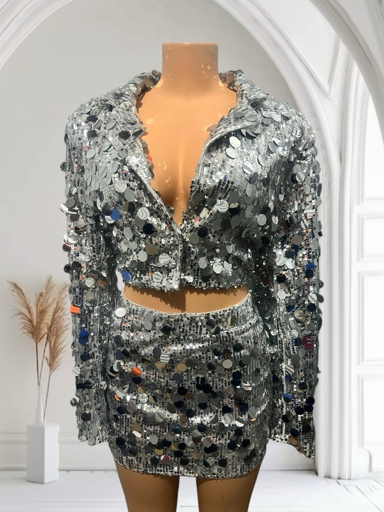 Shine bright in this gorgeous silver sequin two-piece set! ✨ Featuring a cropped sequin jacket with a deep neckline and a matching high-waisted mini skirt, this outfit was made to steal the spotlight. Perfect for a girls’ night out, holiday parties, birthdays, or any event where you want to turn heads. Details: • Condition: New with Tags (NWT) • Size: Large • Color: Silver • Fabric: Sequin stretch fabric (comfortable fit with flexibility) • Pieces: 2-piece set — long sleeve crop jacket + mini skirt • Fit: Slim fit with good stretch for movement • Occasion: Clubwear, Party, Special Event, Birthday, NYE, or Girls’ Night Out • Style Notes: Fully lined for comfort; front zipper jacket closure Care: Hand wash cold or professional dry clean recommended