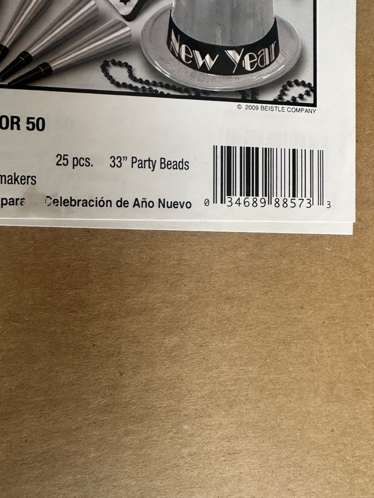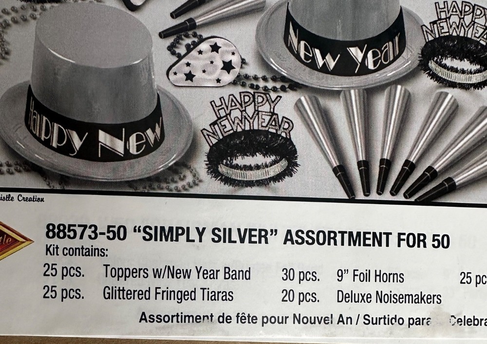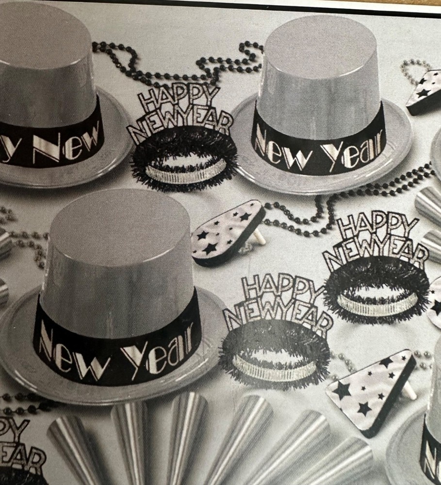 Comprehensive New Year's Eve party kit for up to 50 guests. Includes hats, tiaras, horns, beads, and noisemakers in silver and black festive designs for a complete celebration. • Includes 25 top hats & 25 tiaras • 30 foil horns, 20 deluxe noisemakers • 25 pieces of 33-inch party beads • Silver and black color theme 88573-50 Features: • party • All season • metallic • USA • N/A Size: 50 Condition: New With Tags