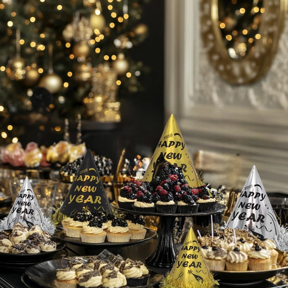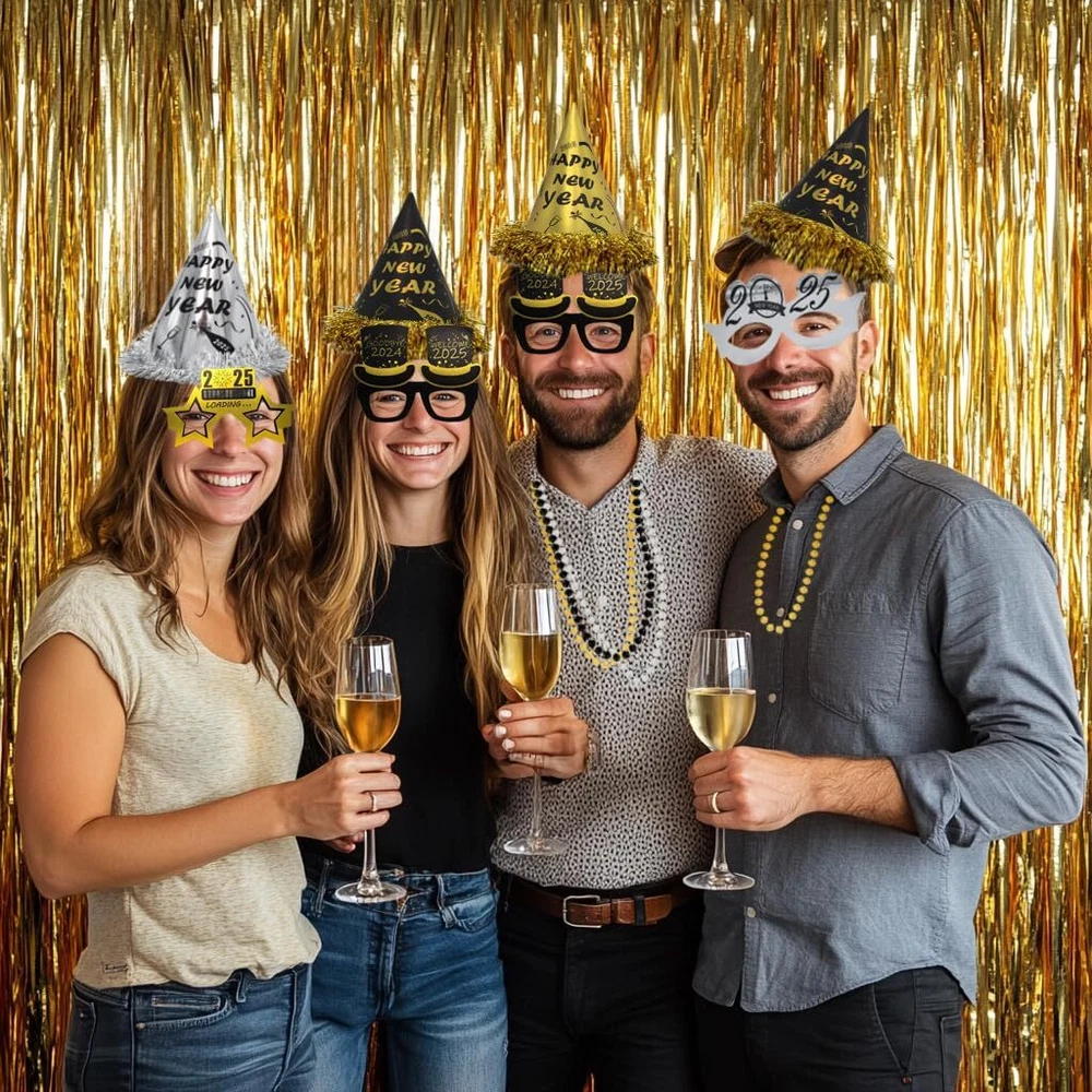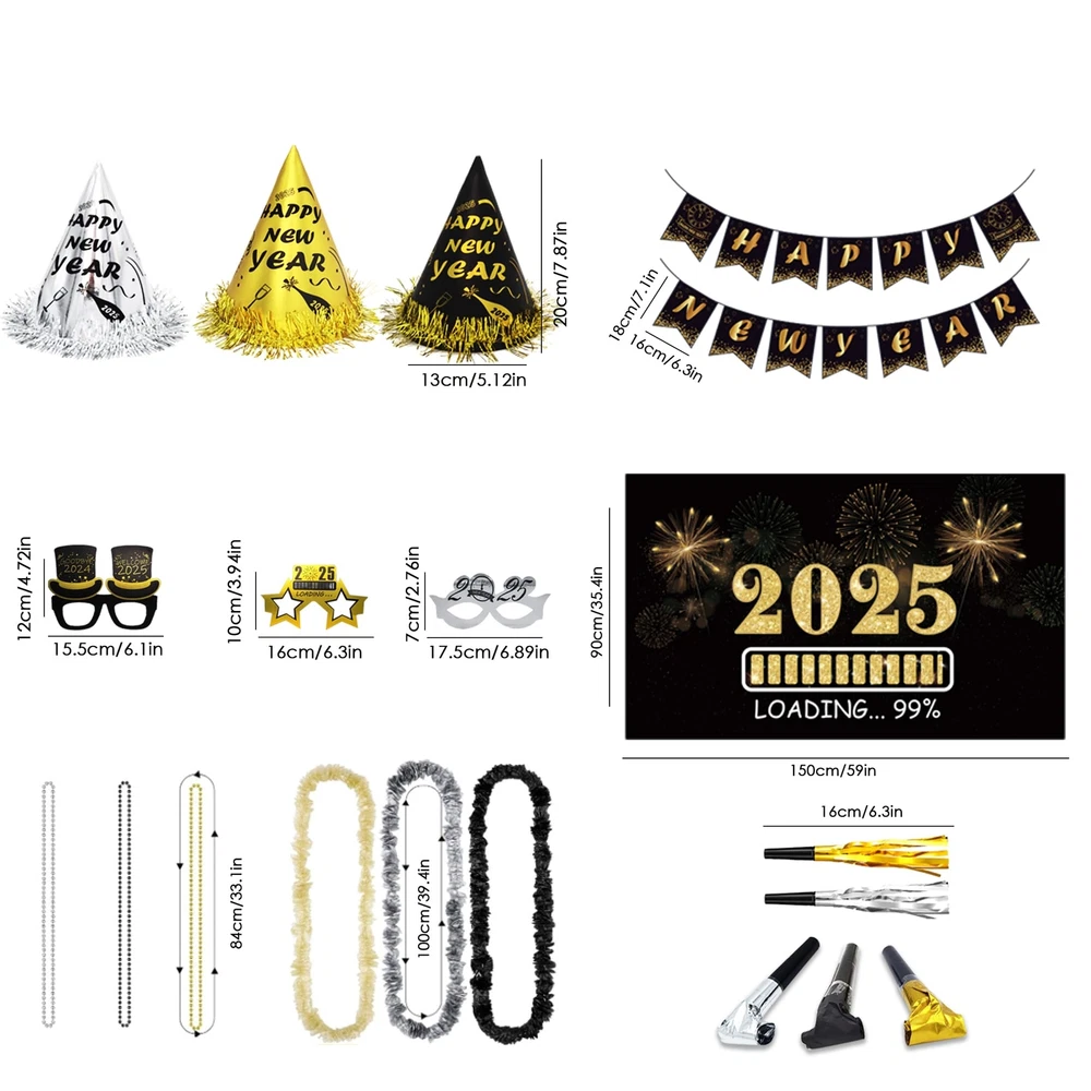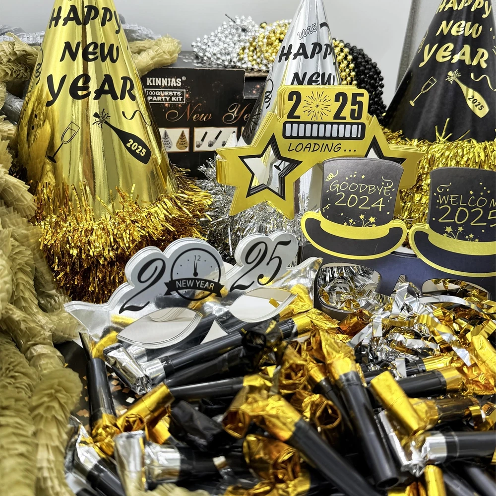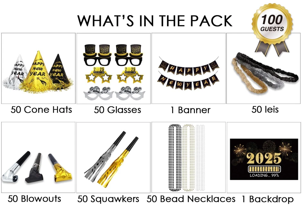 New Years Party Supplies for 100 Guests WHATS IN THE PACK - 50 hats, 50 glasses, 50 les, 50 nacklaces, 50 squakers, 50 blowouts, a foil happy new year banner, 2025 New years party backdrop and a new years party banner HIGH QUALTIY NEW YEAR BACKDROP - The new year backdrop in this pack is made of high quality fabric, which is thick, durable and well printed REAL FOIL - As you see from the picture, the banner is shinny and bright. It's not printed by ink. It's real foil GREAT BOX - All the stuffs are packed in a great box. What's more Different parts are individually packaged in different bags. You don't need to worry about there is a mass in the box 100% GUARANTEED AND CUSTOMER SERVICE - We're absolutely sure you'll love our product. If, for some reason, you are not satisfied with the kit, we provide 45-day money-back. Your satisfaction means the world to us. So feel free to contact us if you have any question
