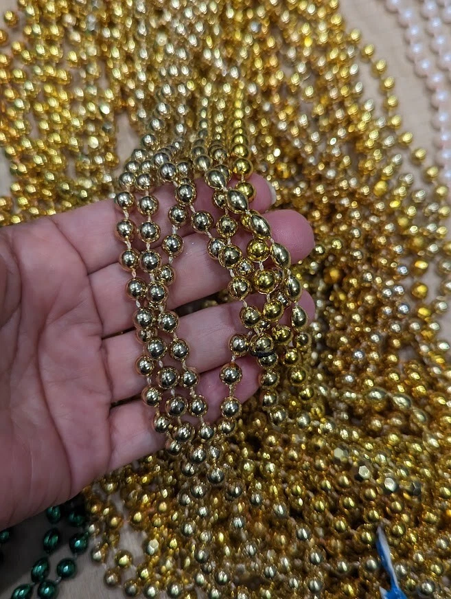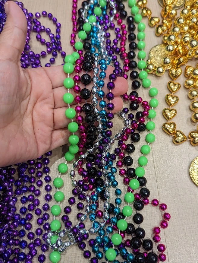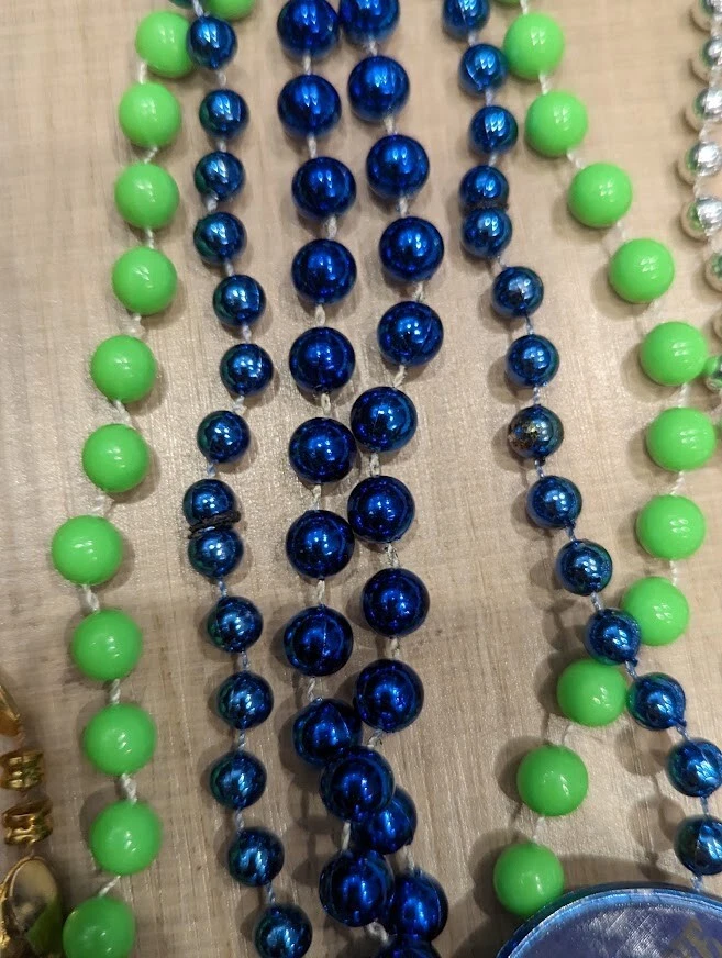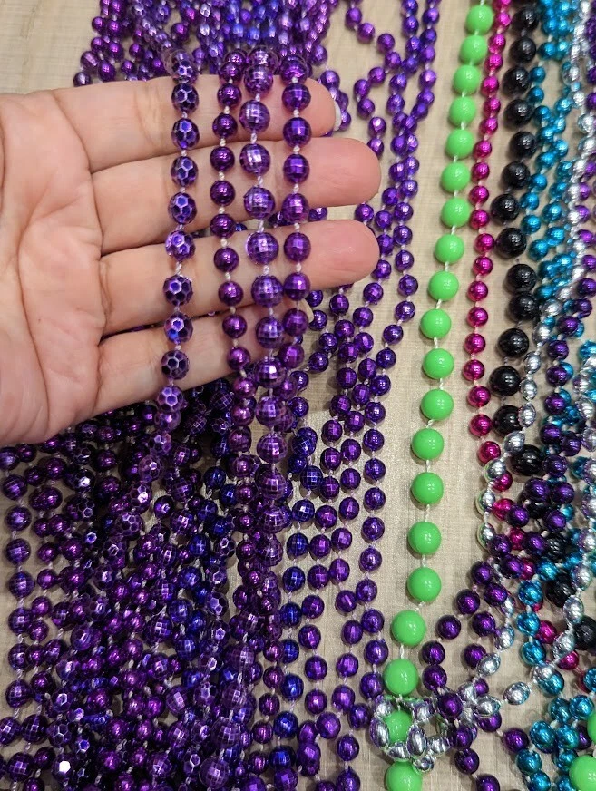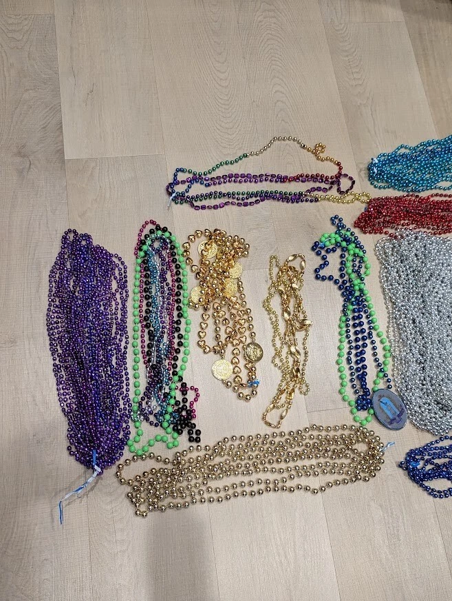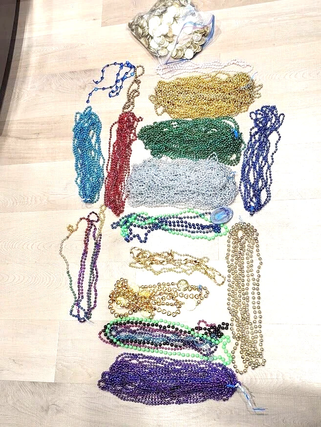 Up for bids are some Mardi Gras Beads and gold plastic coins Lot approx 12 pounds They were caught in Louisiana and October fest in Key West Florida There is a large Variety of Colors and Styles. Only one bead is broken but can be repaired easily All items were caught during festivals so they are pre-owned but only used that one time, so they are in great condition. Kept in a smoke free pet free home