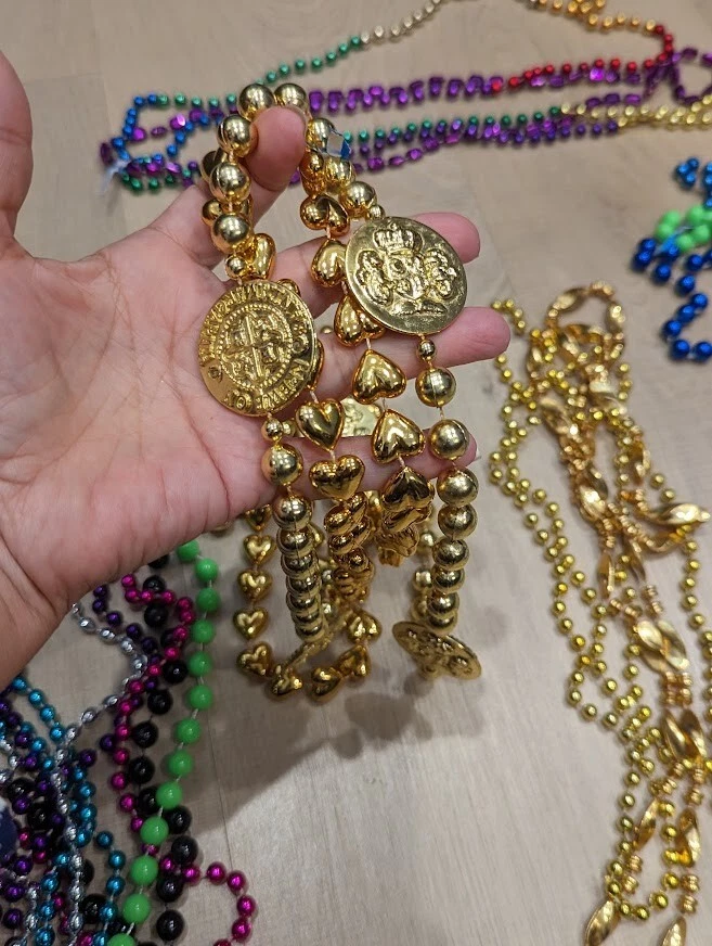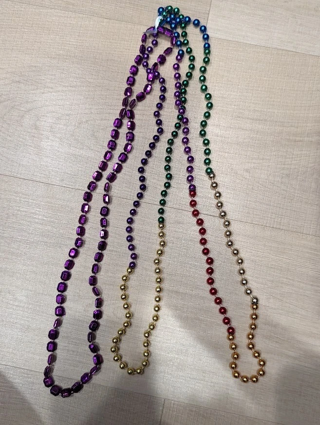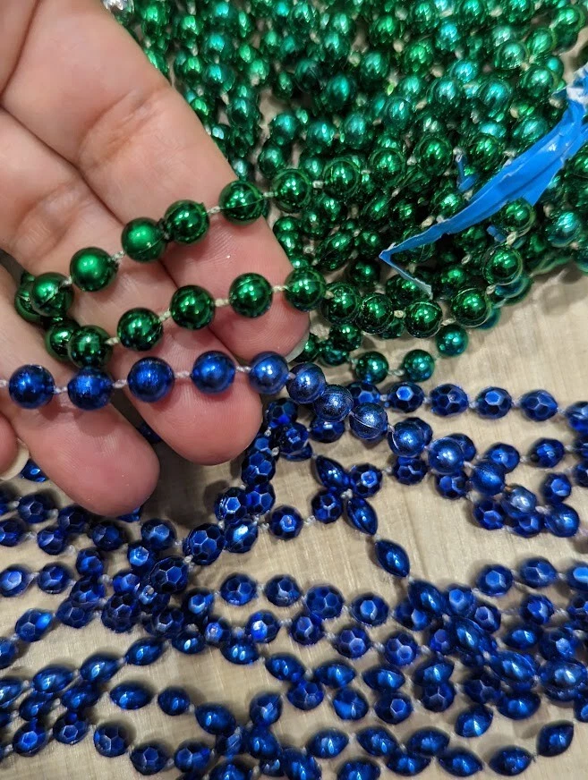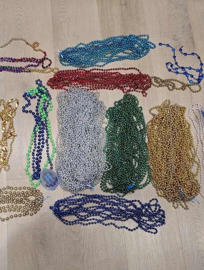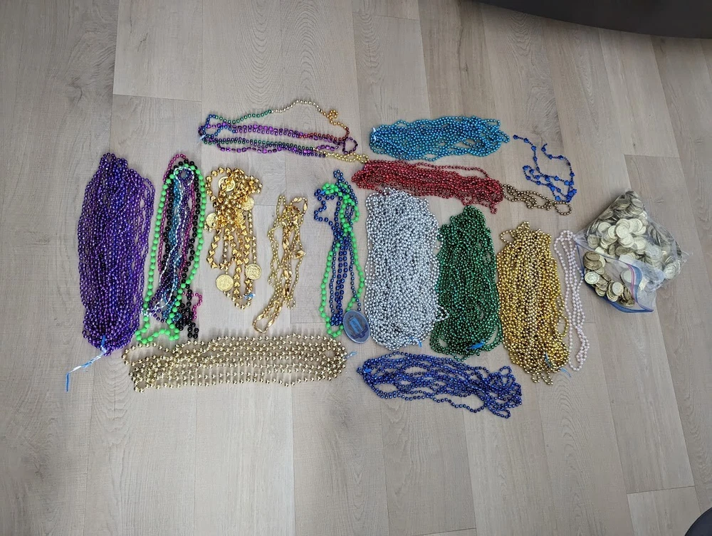 Up for bids are some Mardi Gras Beads and gold plastic coins Lot approx 12 pounds They were caught in Louisiana and October fest in Key West Florida There is a large Variety of Colors and Styles. Only one bead is broken but can be repaired easily All items were caught during festivals so they are pre-owned but only used that one time, so they are in great condition. Kept in a smoke free pet free home